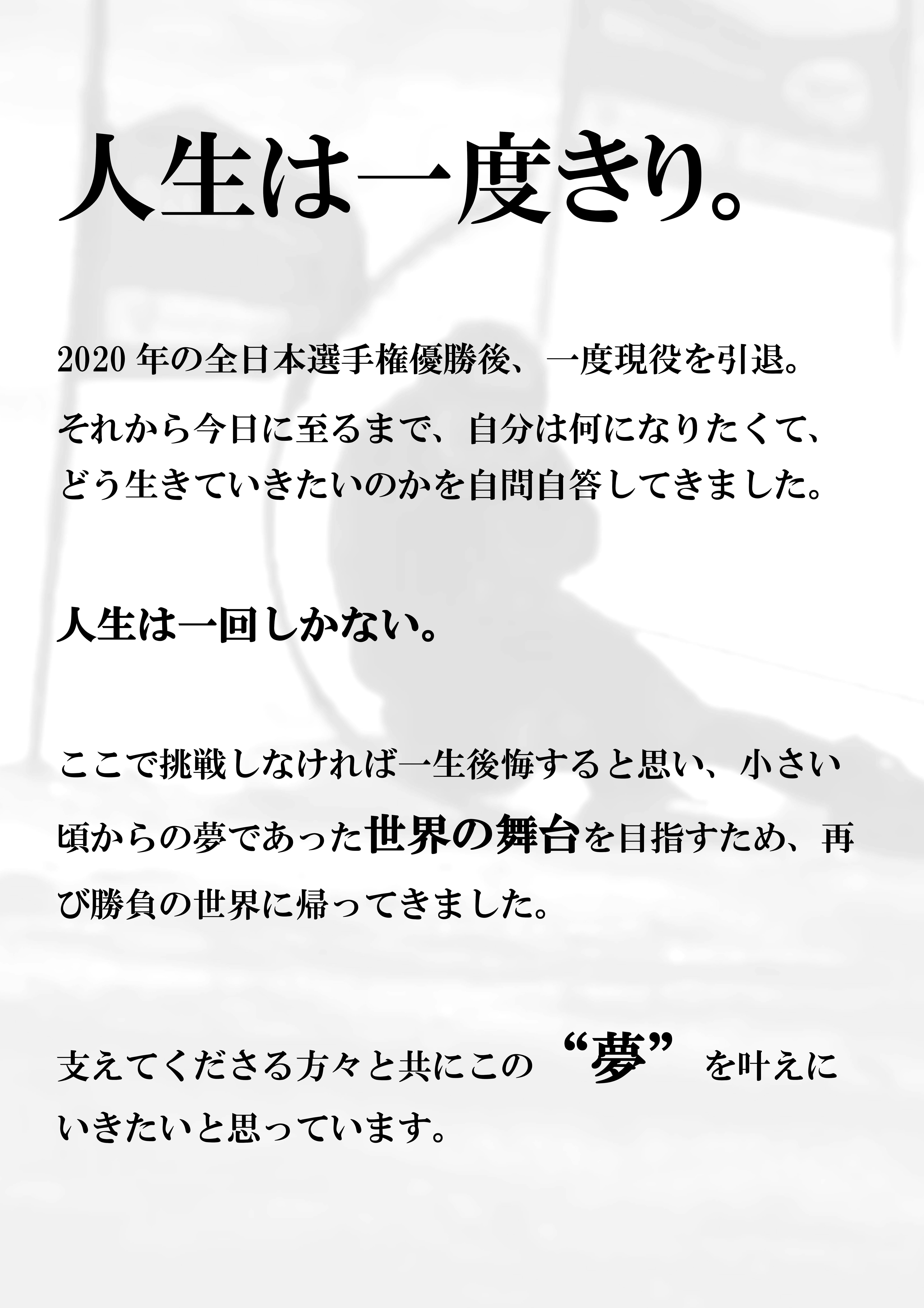 皆様こんにちは!プロジェクトオーナーの高橋大成です。5月にスタートしたこのプロジェクトですが、昨日目標を達成いたしました。本当に、本当にありがとうございました。現役を2020年に退き、2022年に大学へ編入。新聞奨学生として過ごす中、「もう一度競技スポーツで世界と勝負するんだ。」と6畳もない部屋で決心してから1年が経ちました。今このように夢を追いかけることができるのも、応援してくださる皆様のおかげです。この支えがなければ今の私はありません。小さな頃に夢見た「オリンピックの舞台に立ちたい」という純粋な思い、絶対に這い上がるという強い気持ちを今後も忘れず毎日コツコツと頑張って参ります。そして、自分の活動が誰かに「元気」を与えることができたとすれば、それはこれ以上ない喜びです。このプロジェクトも残り数時間ですが、最後の最後の最後まで駆け抜けていきますので、よろしくお願い申し上げます!高橋大成 もっと見る