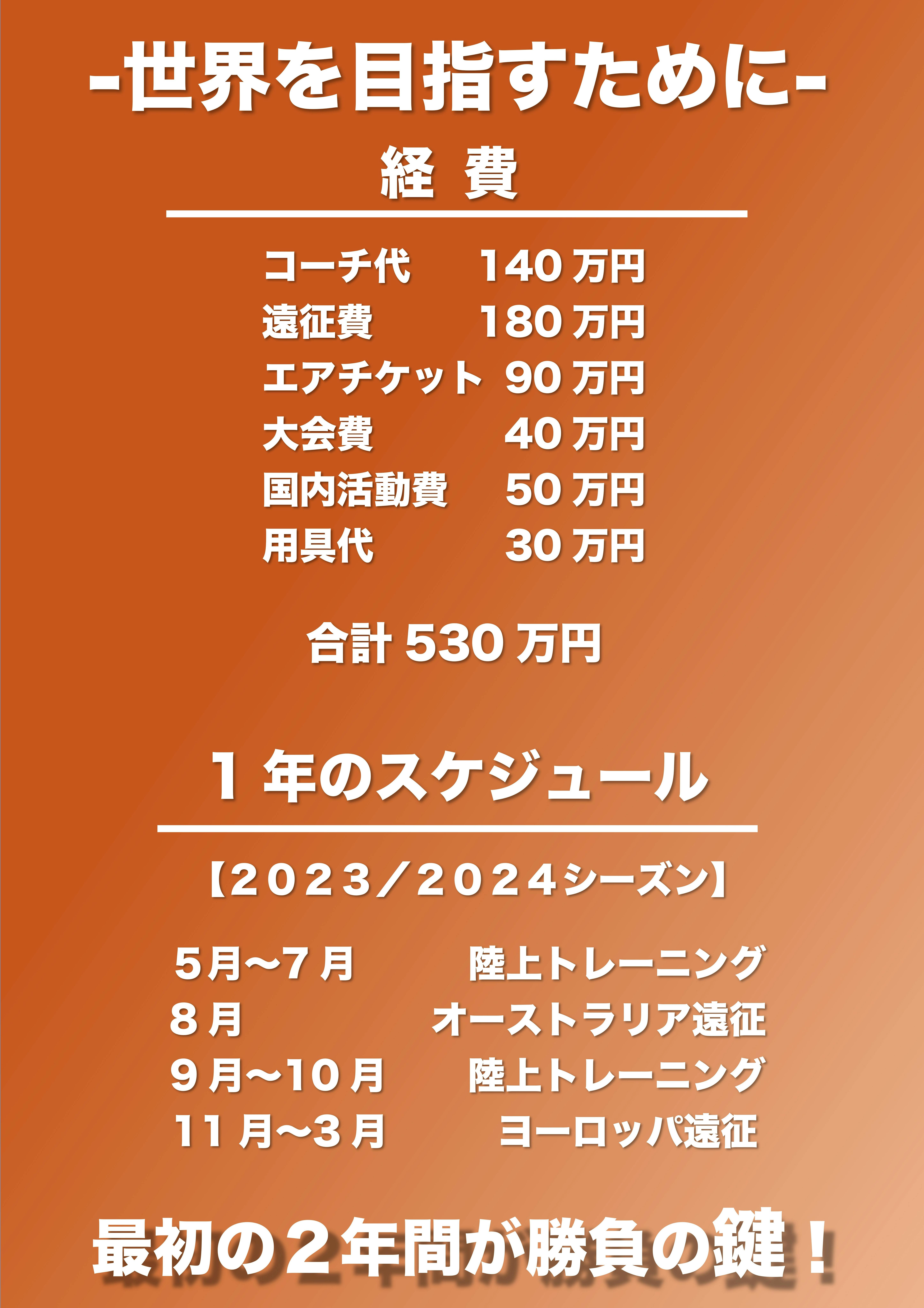 スキークロスで世界を目指すためには、国内に冬季期間の練習環境や大会が充実していないため、主にヨーロッパでの活動が必要となります。 そのために必要な資金は以下の通りとなります。