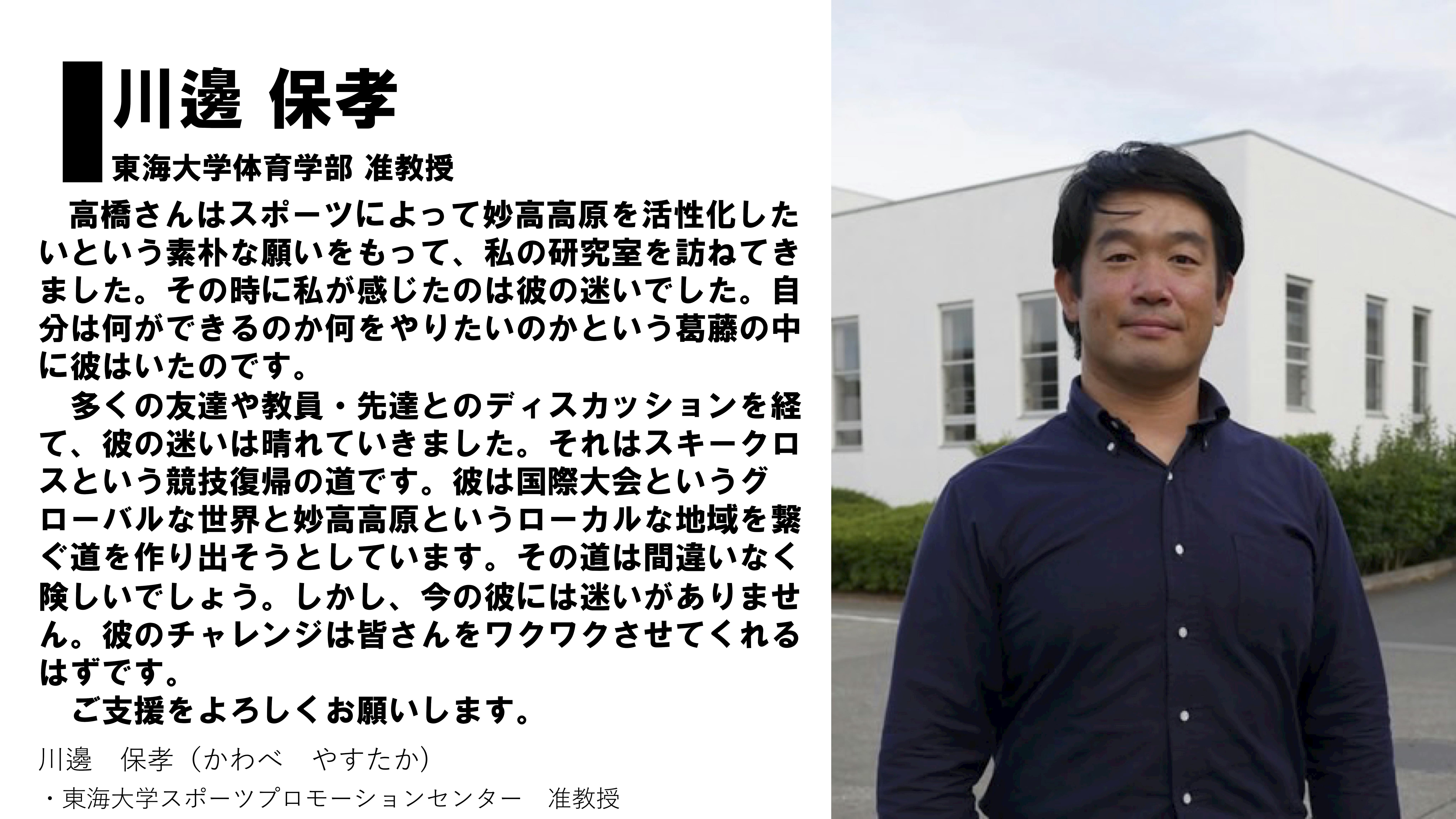 僕は引退してからの2年間、残りの自分の人生をどう使うかということを毎日考えて過ごしてきました。この過程で導き出した答えが、スキークロスで世界を目指すという今回のプロジェクトです。皆様のご支援は決して無駄にはしません。夢を叶えるため、そして妙高を元気にできるよう全力で頑張って参りますのでどうかご支援のほどよろしくお願い申し上げます。