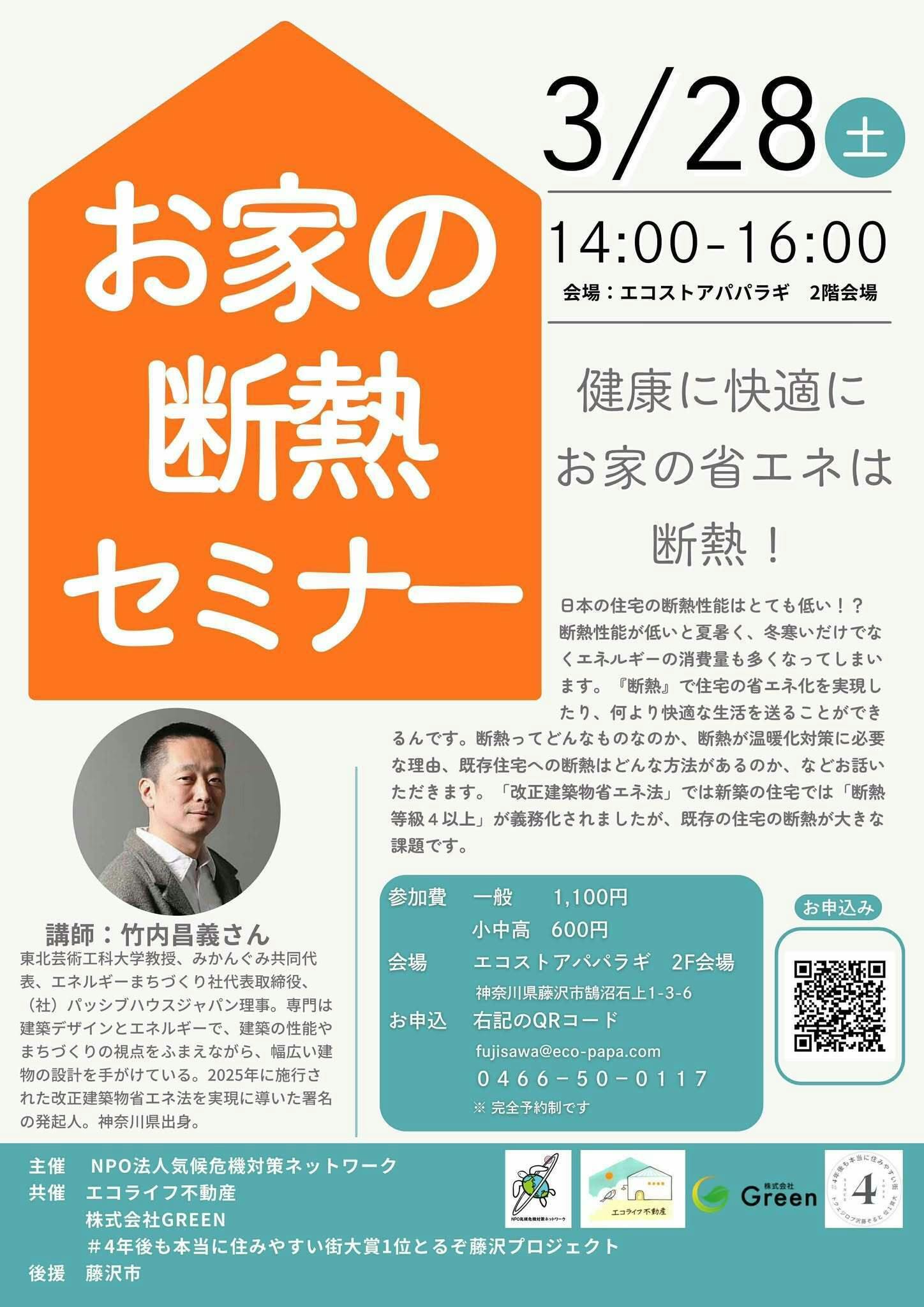 2026/03/11 11:50お久しぶりの投稿です。ふじさわ学校断熱ワークショップ実行委員会の藤法です。報告が遅くなりましたが昨年、「学校断熱ワークショップ」の取り組みが2025年グッドデザイン賞に選ばれました!皆さんに支援していただき実現できた「小糸小学校の断熱ワークショップ」も、この取り組みの一連の流れに入っています。本当にありがとうございました。引き続き藤沢市には学校や体育館の断熱化が必要であることを伝えています。さて、今月末ワークショップでもお世話になった竹内昌義さんが、藤沢でセミナーを実施します!◆3月28日(土)14:00~16:00お家の断熱セミナー場所:エコストアパパラギ2階参加費:一般 1,100円 小中高 600円申込みはこちら断熱についての疑問解消&グッドデザイン賞をとったお話も、お時間のある方はぜひご参加ください!※藤沢市外で対面参加が難しい方には3月17日にオンラインでのセミナーもご紹介です。「ゼロエミッションを実現する会」さんの主催であるそうです。▼▼▼https://zeroemi.org/insulation-webinar20260317/ もっと見る