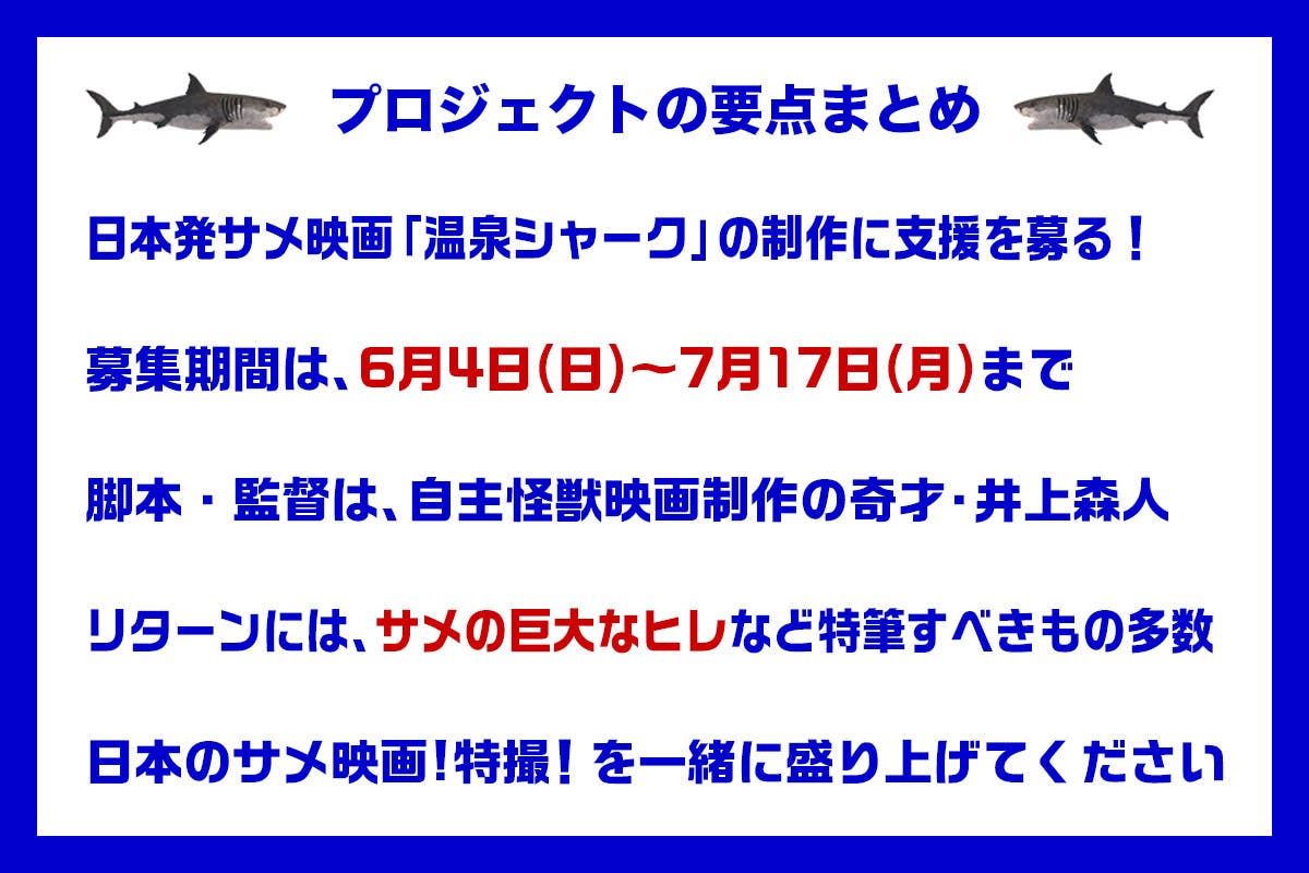 サメ映画ルーキー: 『サメ映画の一大消費地として世界的に有名だった日本で、ついにサメ映画の地産地消プロジェクトが立ち上がりました。熱海を舞台にしたご当地サメ映画……と聞けば、温泉にサメを出すのは当然の成り行きです。陸海空を制覇し、家やトイレにまでサメが出るこのご時世、温泉にサメが出るのは当たり前のことと感じる方も多いでしょう。しかし、このプロジェクトは熱海のもう一つの側面、即ち「怪獣」の聖地としての要素も積極的に取り入れてきます。『温泉シャーク』は日本のカルチャーを代表する特撮を全面に押し出し、世界へ羽ばたく日本産サメ映画となるのです。「サメ映画貿易赤字」に長年苦しんできた日本の反撃の狼煙は、熱海の温泉から上がります。何卒皆様のご支援を!』