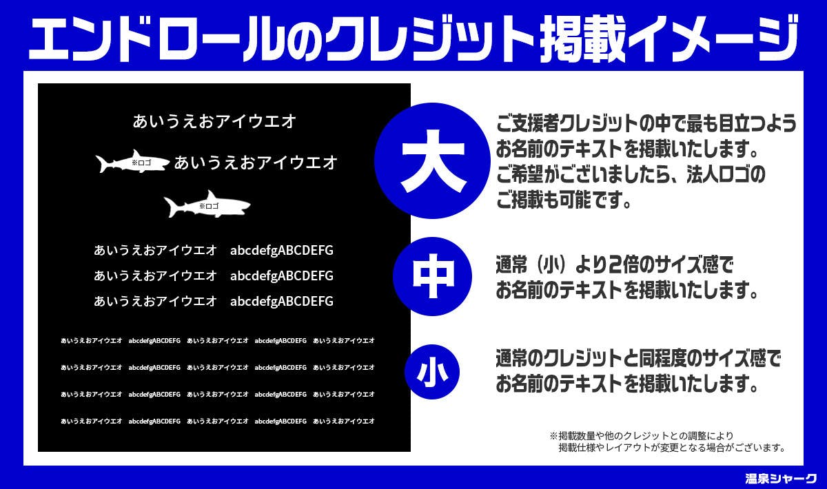 リターンによって、エンドロールの掲載サイズが異なりますので、ご注意ください。