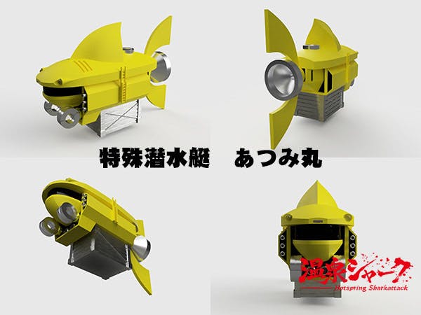 サメの登場シーンは、サメできるだけ特殊造形で制作し、特撮を行って撮影します。もちろんCGも使います。また、サメと人類との対決シーンでは、マッチョや特殊潜水艇など出てきて、サメ映画ファンはもちろん、特撮ファンにも楽しんでもらえるものに仕上げます。温泉シャーク実物大の尾びれ、背びれのほ、操作できるサメのお顔のギニョール、サメに対抗する特殊潜水艇などを制作して、撮影します。