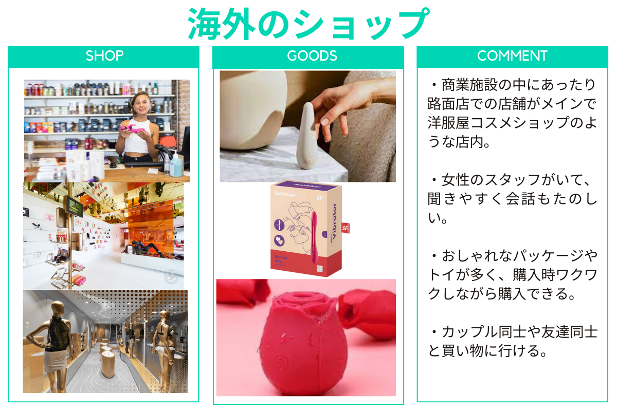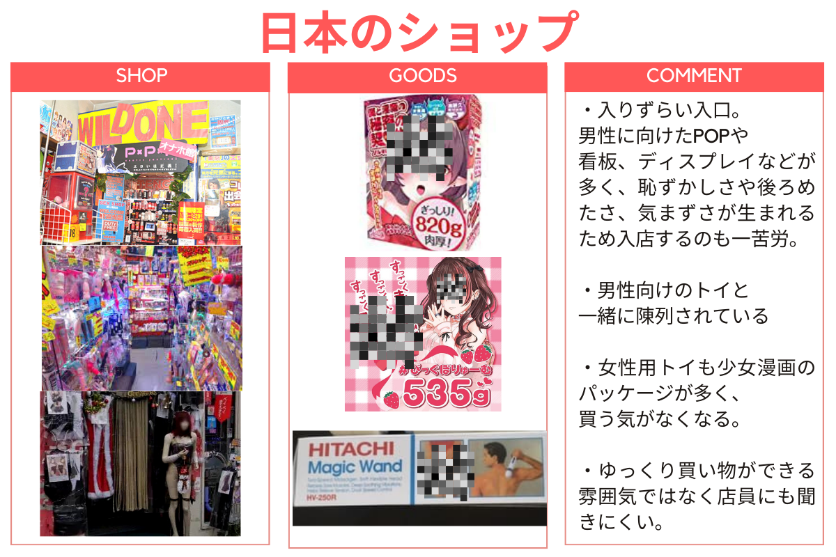 なぜそんな抵抗感が生まれてしまうのか分析したところ、日本のトイショップは男性専用のお店がほとんどであることや、(女性向けの商品であっても)男性向けのパッケージのものが多いことが理由でした。