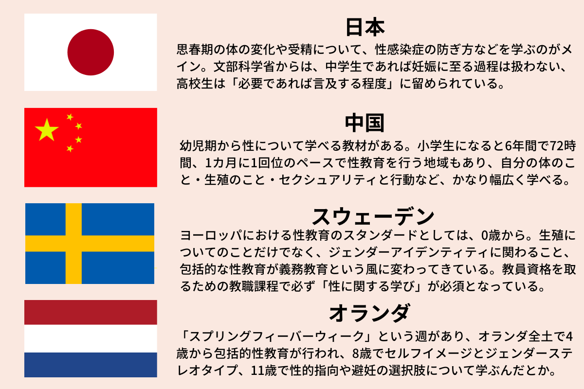 日本の性教育は、先進国の中で一番性教育が遅れており、世界中から『性教育後進国』と言われているほど。世界の性教育基準は進む中、私たちは30年前よりと変わらない性教育を受け、正しい情報や知識がないまま大人になっていきます。