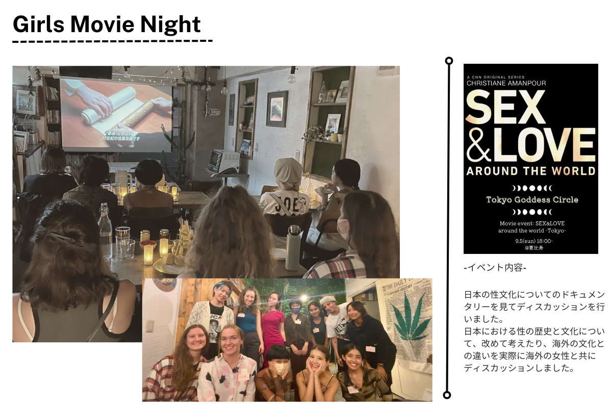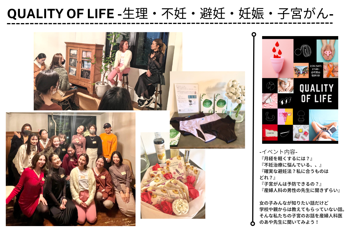 女性同士のディスカッションイベントや、産婦人科の先生をお招きし性の悩みを相談・解決していくためのイベントなどを行ってきまおります。また自ら性教育や女性の本音を伝えるために、Youtuberとして発信や、スタンドアップコメディアンとして性暴力・性被害・性文化の社会風刺活動などおこなっています。