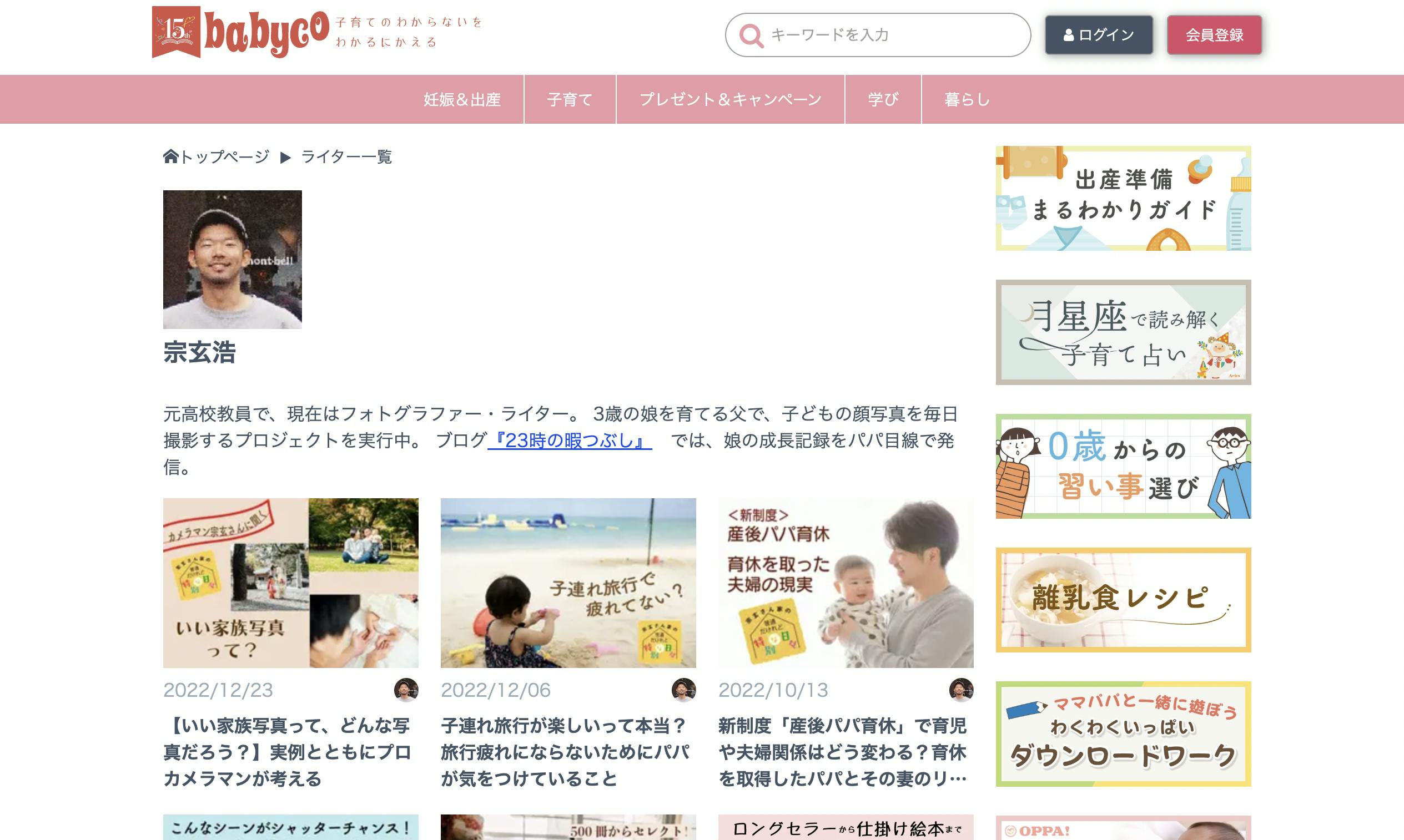 また、ライターとしては子育て応援サイトbabycoで育児コラム「宗玄さん家の普通だけど特別な日常」を連載するなどの活動をしています。