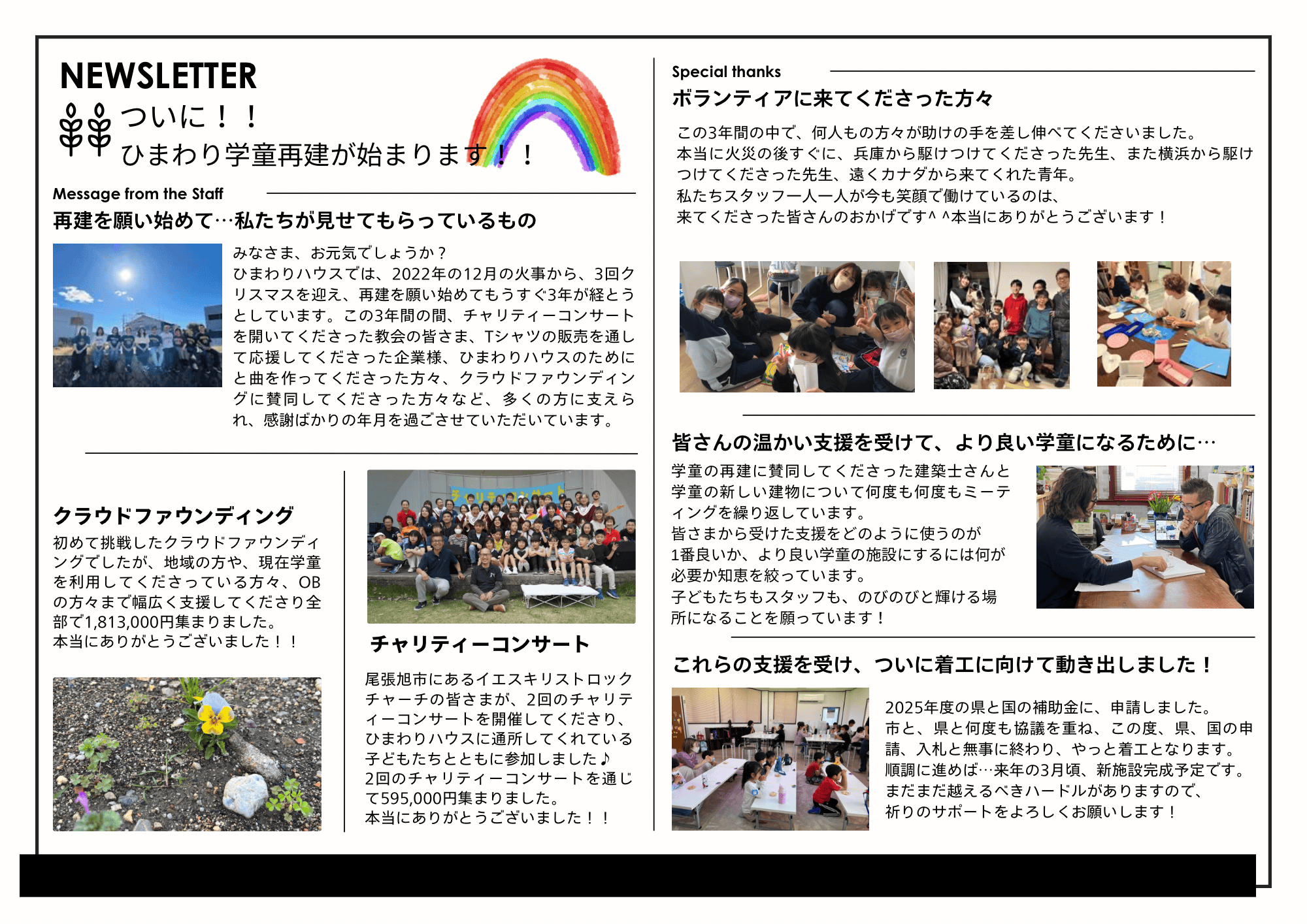 お会いした中岡先生、井野口先生からは、今回の火事の中で奇跡的に教会堂が延焼から守られたという証や、ひまわり学童の再建に向けた前向きな決意を伺い、この地域を愛し、子どもたちを愛する先生方の思いに強い感銘を受け、出来ることは何でもお手伝いしたい、という思いが与えられました。その思いは今日も変わりません。「ひまわり学童」が地域にとって無くてはならない子どもたちの居場所として、守られ広がっていくことを心から期待して、応援メッセージを送らせて頂きます。