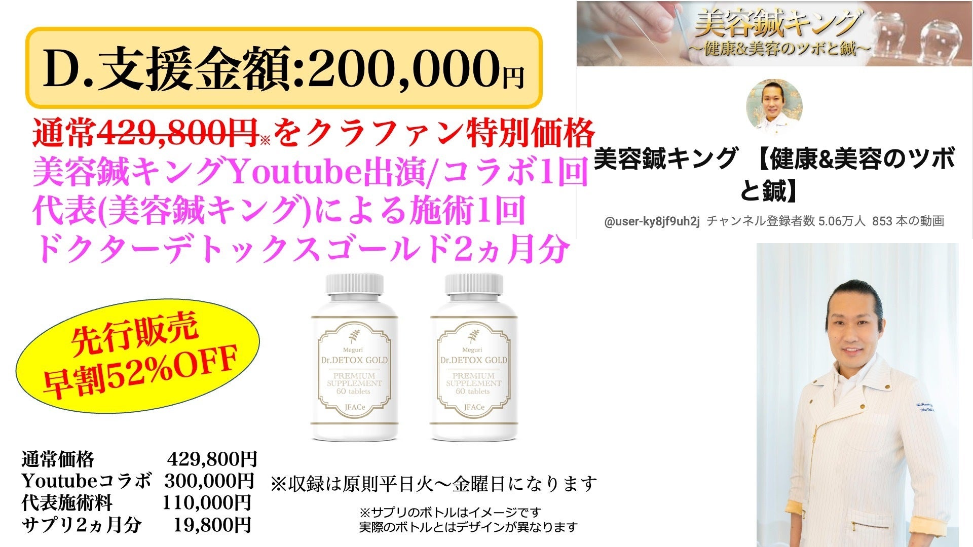 2023/06/21 18:53支援者の皆様この度は、お待たせ致しまして申し訳ございません。製造ラインの確保が出来ましたためご報告致します。錠剤の製造は、今週にございます。また、ラベルの出来上がりが7月初旬頃となります為、錠剤をボトルに入れてラベルとシュリンクをかけ皆様のお手元に届くのが7月中旬〜下旬となります。セットアップが数百個でも出来次第で納品してもらうよう進めております。また、画像は決定となった美容鍼キング 上田代表の写真入りのラベルデザインです!お楽しみにお待ちくださいませ。 もっと見る