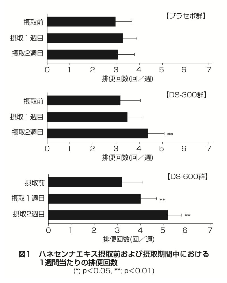 ある実験(※)では「プラセボ群とハネセンナエキス300mg/日と600mg/日を比較すると300mg/日では摂取前と比較して1週間で排便量が改善傾向、2週間で有意な増加が認められ、600mg/日群では1週目および2週間目に排便量に有意な増加が認められています。また特にリスクとなる事象は認められませんでした。1日あたり300mg/日を2週間継続する便通改善傾向があり、600mg/日の方がより改善できること」がわかりました。※
