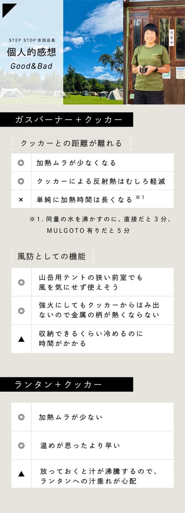 名古屋市名東区にあるアウトドアショップ「STEP STOP」の店長、吉田さんにMULGOTOを使ってもらい、感想をいただきました。吉田店長はアウトドア歴10年以上のベテランです!