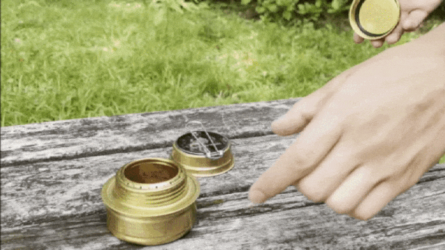 セットのリターンにある「OutdoorHolic」ロゴ入りアルコールストーブは、スクリューキャップタイプで消化蓋も付属しています。消化蓋はスライドさせて火力調整ができる仕様です。