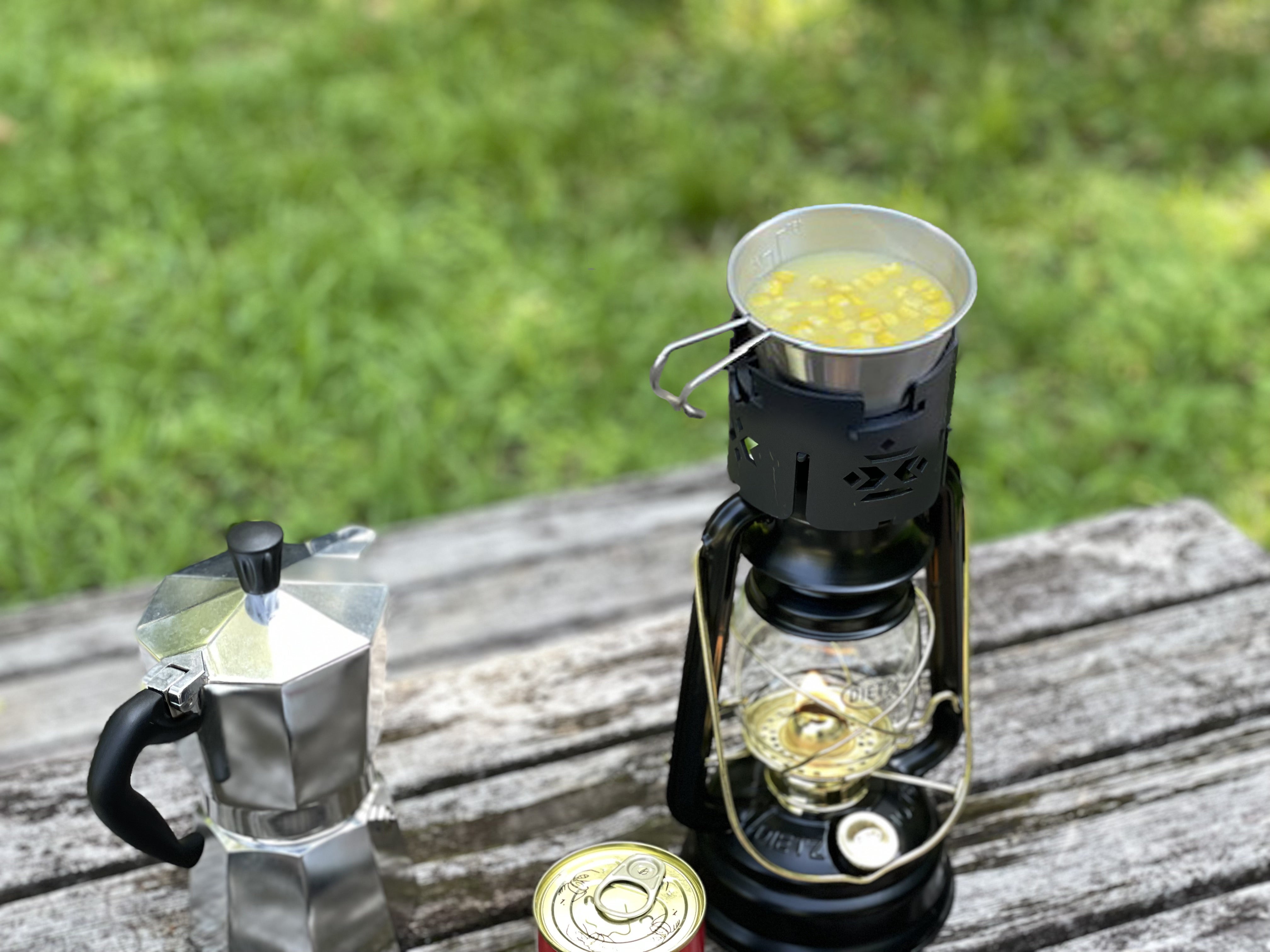 キャンプ飯やおつまみに人気の缶詰3種をシェラカップに移してランタンの上で温めてみました。