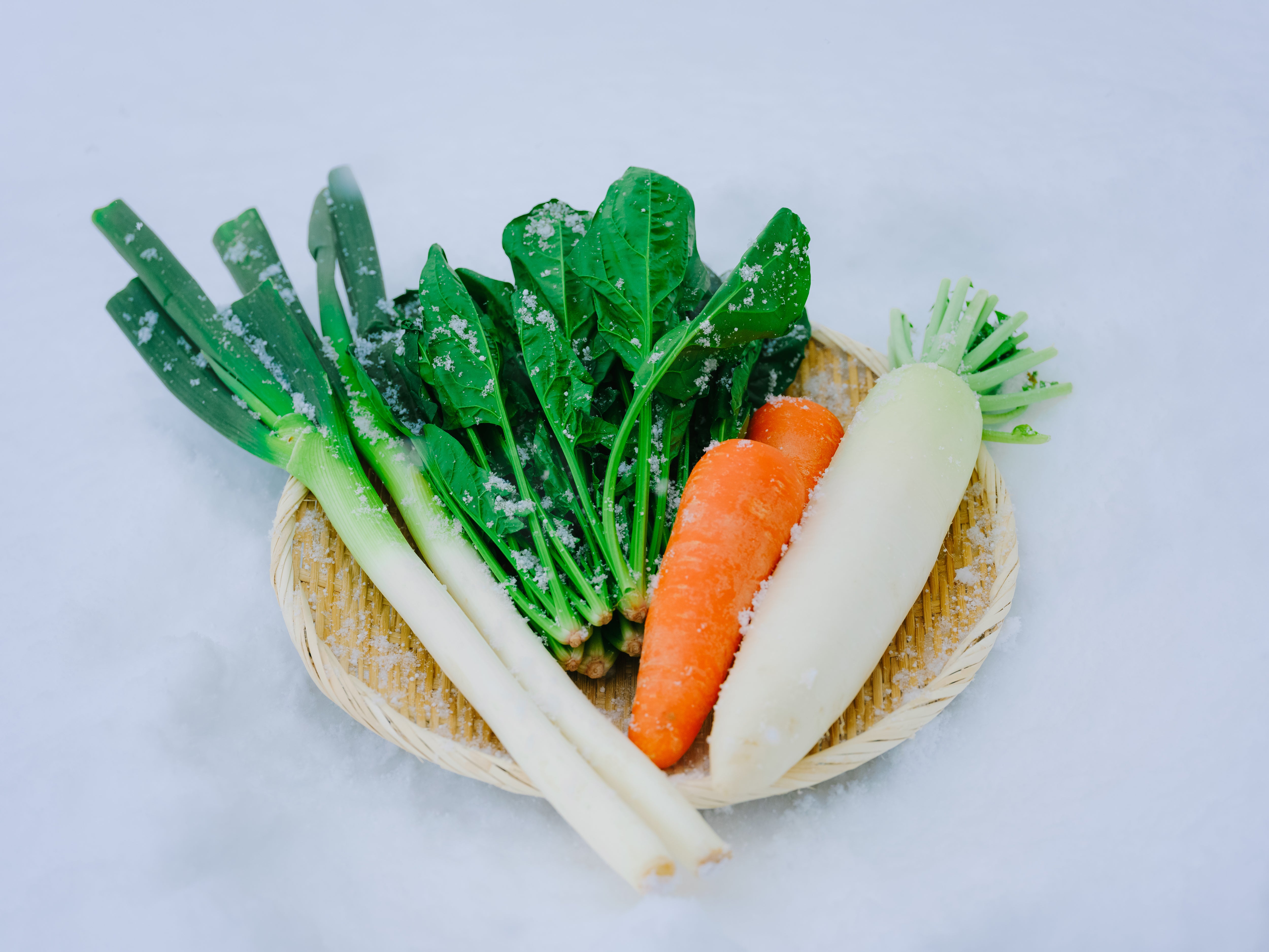 吉村さんが仕入れた大根・人参・ねぎ・ほうれん草の野菜と地元湯沢市の老舗味噌店、武石麹店が米麹・大豆・塩・水だけで製造し雪中貯蔵した無添加味噌をお届けします。糖度が上がりみずみずしさが増した人参や大根は、特有の辛みや野菜臭さがないため、野菜スティックに最高です。大根は、東京都内のイタリアレストランの料理長に「梨のように甘い」と評価をいただいています。