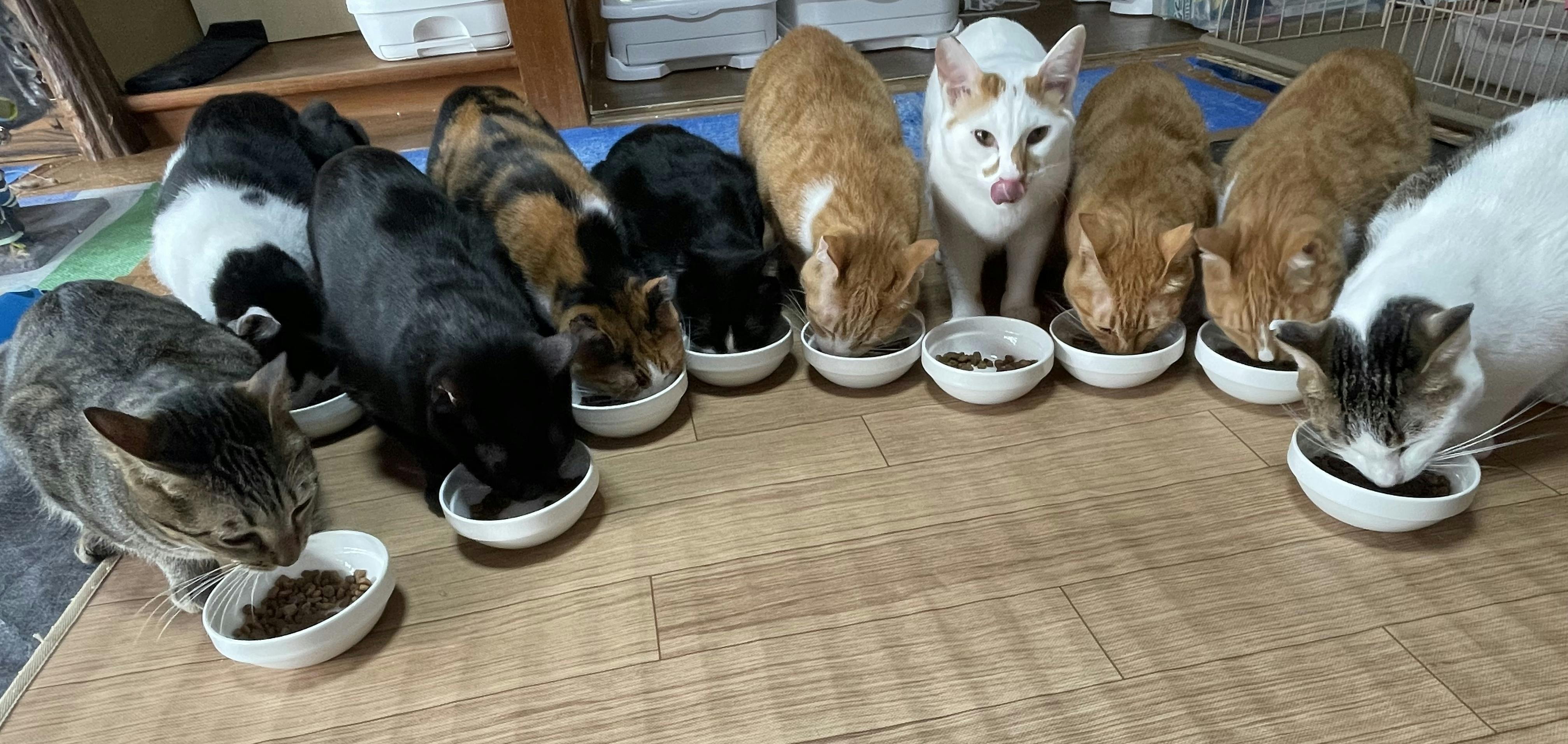 現在35匹の猫たちがハウスで暮らしています。第二種動物取扱業も届出済です。もなねこでは「食事・衛生的な環境・遊びのコミュニケーション」を軸に日々のお世話をしています。健康で元気いっぱいな子もたくさん居ますが中には持病があり里親さんへ繋げることが難しい子も居ます。体調が不安定な子たちは日々のケアや通院が必要です。そんな子たちは個別にごはんを工夫したり治療食を食べさせたり投薬もしながら健康管理をしています。毎食の食器も1匹ずつ使用し、いつもきれいな食器でごはんを食べれるようにしています。「それぞれ食事量・体調・トイレの様子」は毎日申し送りをして全員がその日の猫たちの体調がわかるようにしています。ごはんや薬をするスタッフは猫たち全員の名前・体調をしっかりと把握している5名と決めていて猫たちの体調管理を徹底できる態勢を整えています。食事管理以外のお世話も衛生面の管理を常に心がけていて、毎日のお世話はトイレ掃除と消毒・掃除機・洗濯・消毒液で床や棚キャットタワーを拭いて除菌しながら猫たちが快適に暮らせる環境を整えています。猫たちと遊ぶことも欠かせないコミュニケーションで時間が許す限り一緒に遊ぶようにしています。たとえ体調が不安定でハウスで生涯を過ごすことになっても「もなねこで暮らせて幸せだった」と思ってくれるような心のこもったお世話をこれからもしていきます。