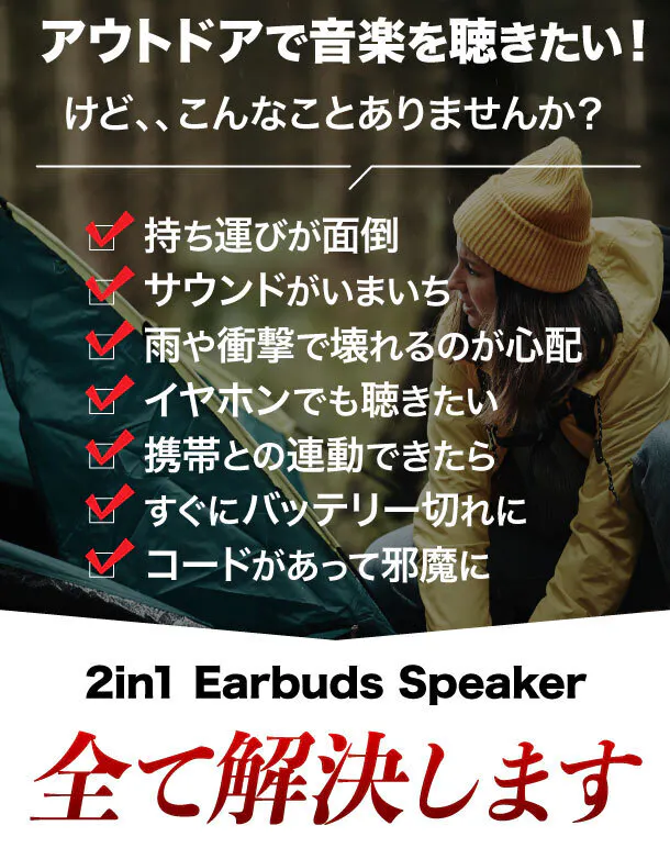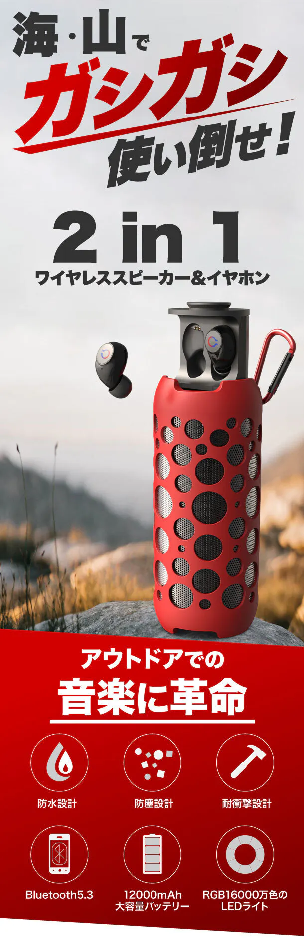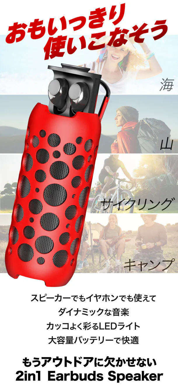 海辺でもキャンプ場でも。<2in1ワイヤレススピーカー&イヤホン>は、今までスピーカーで聴いていた音も、周りの環境に応じてイヤホンに切り替えて聞くことができます。