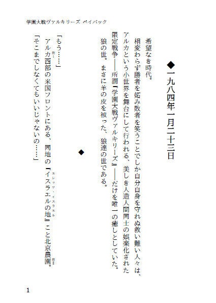 救い難い人々の唯一の癒しは、アルカという小世界を舞台として行われる、美しき人造人間同士の娯楽化された限定戦争――所謂『学園大戦ヴァルキリーズ』だけであった……。
