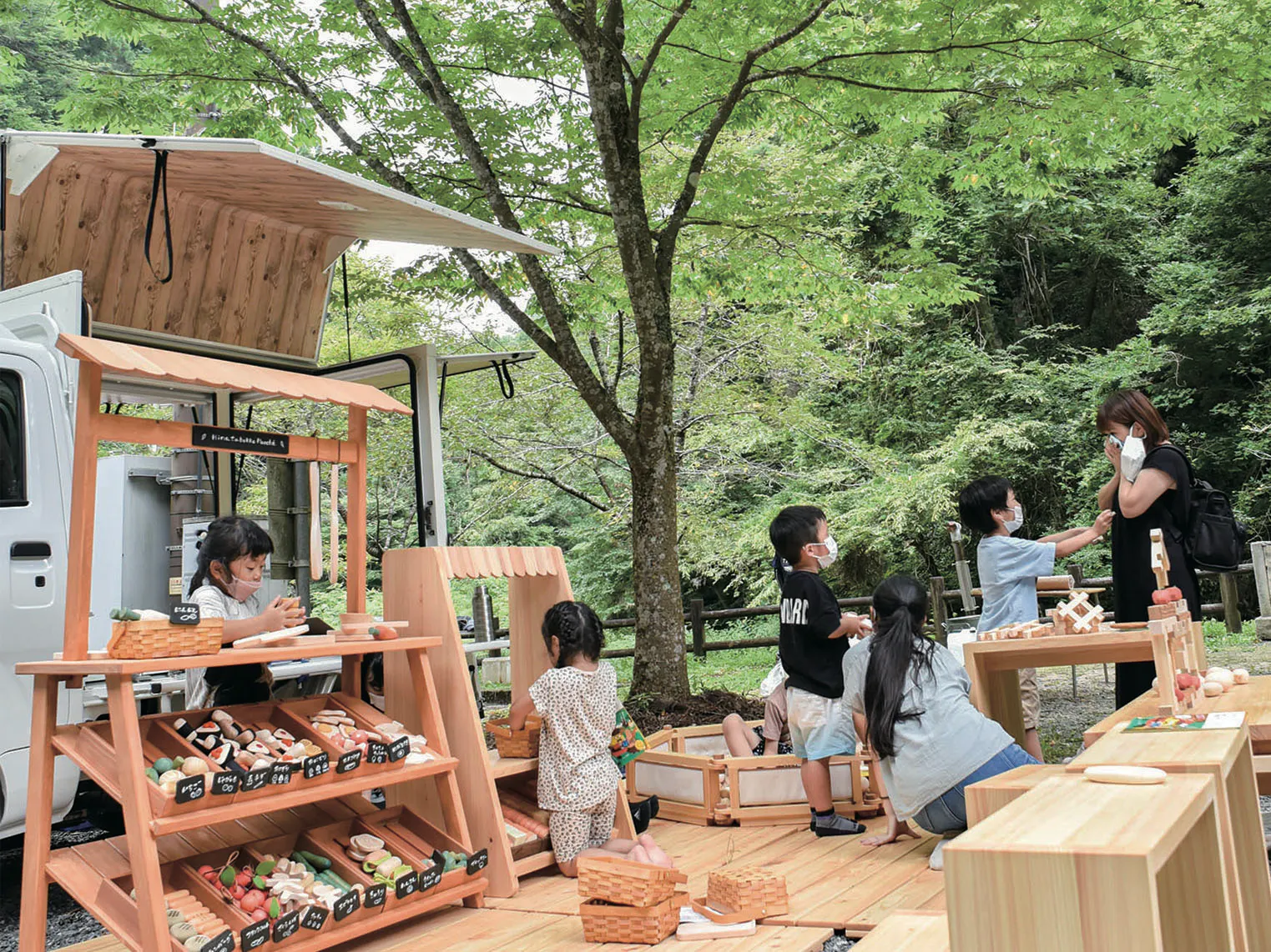 その時の経験と全国でも珍しい女性だけの木工所として、何ができるだろうか、木を五感で感じることにより効果の実証試験などにも取り組んできたからこそ「木のおもちゃやワークショップで子育てをサポートできないか」「木育を通して木の魅力と可能性を多世代に伝えたい」「何か災害があった時には安心できる授乳室や遊び場を提供したい」という想いが募り、ダイハツ広島販売株式会社さんとダイハツ工業株式会社の「nibaco」を活用した、木育デリバリー事業をスタートしました。