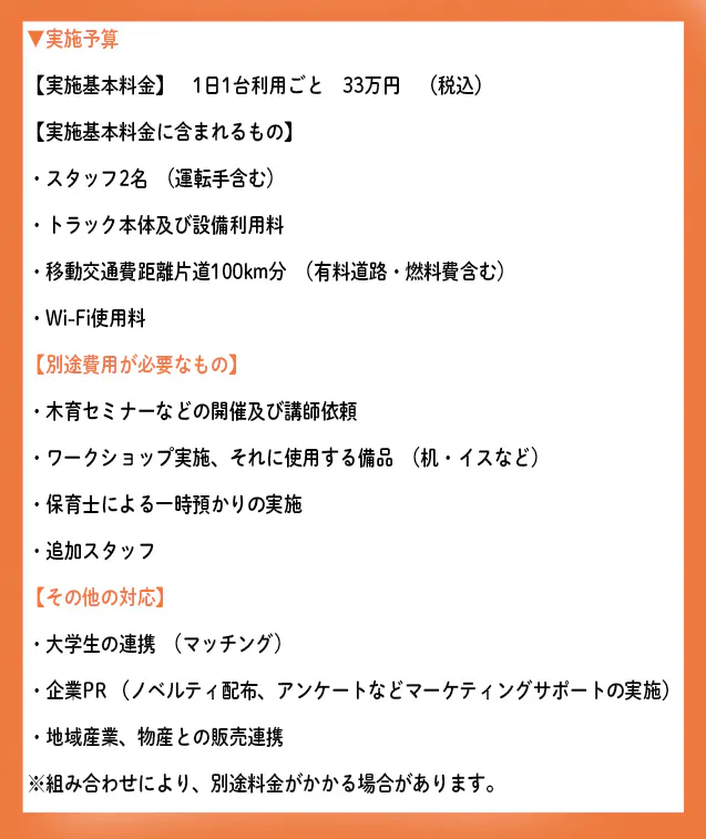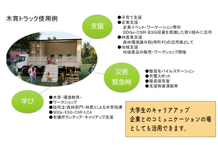 その事業の中で、雨天の問題と授乳室などのサポートもするのであればもっとスペースということから、今回の2トントラックを使用する「木育トラック」プロジェクトが立ち上がりました。