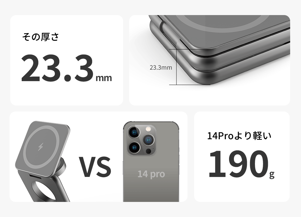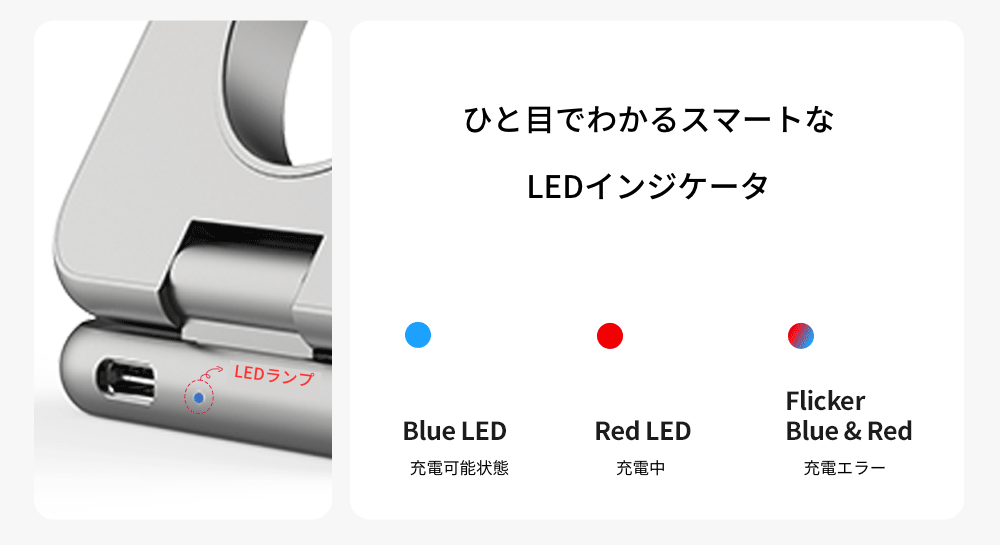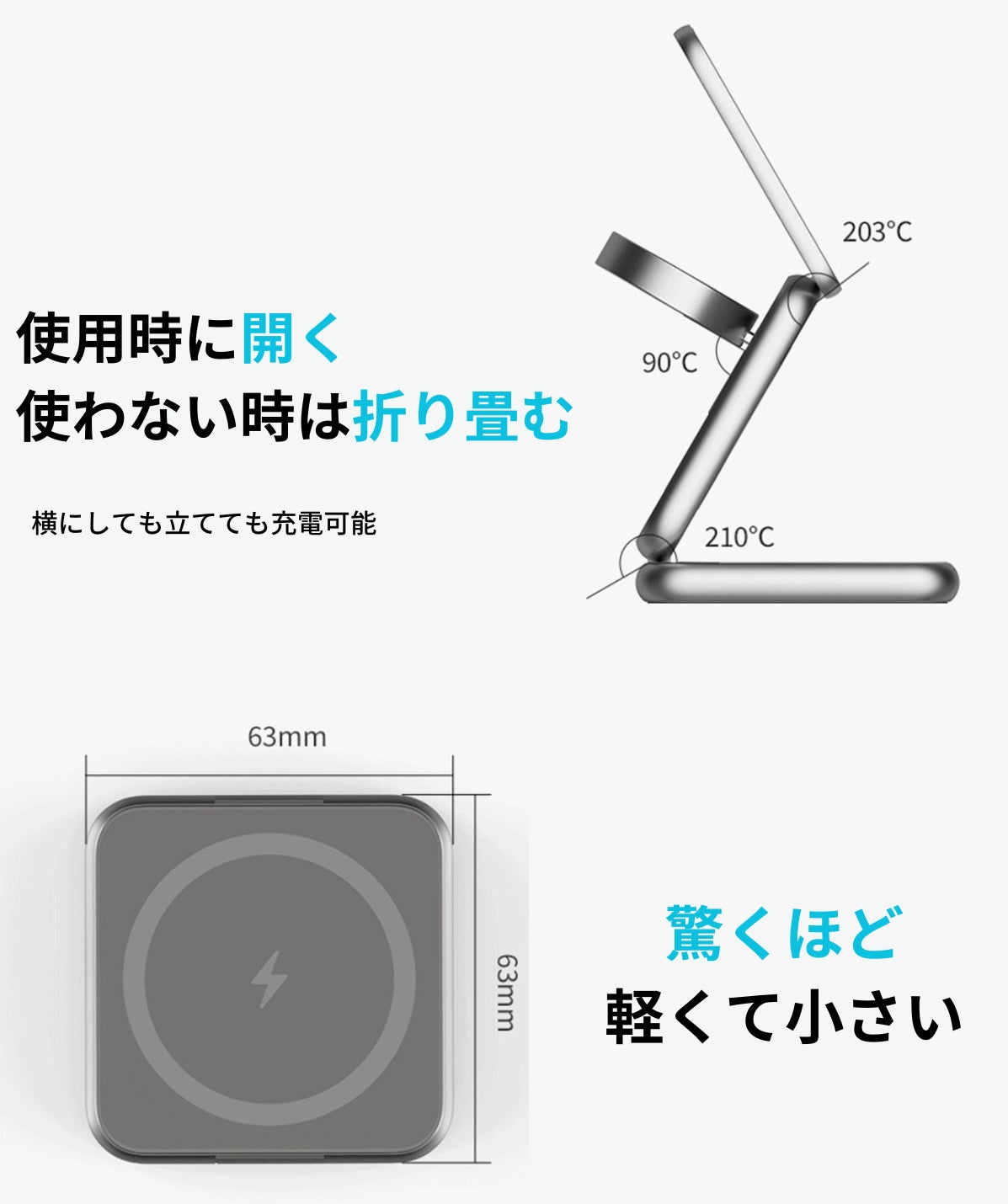携帯性と角度調整ができる大幅な進歩により、“アタラシイ”ワイヤレス充電として今後のスタンダードとなることでしょう。