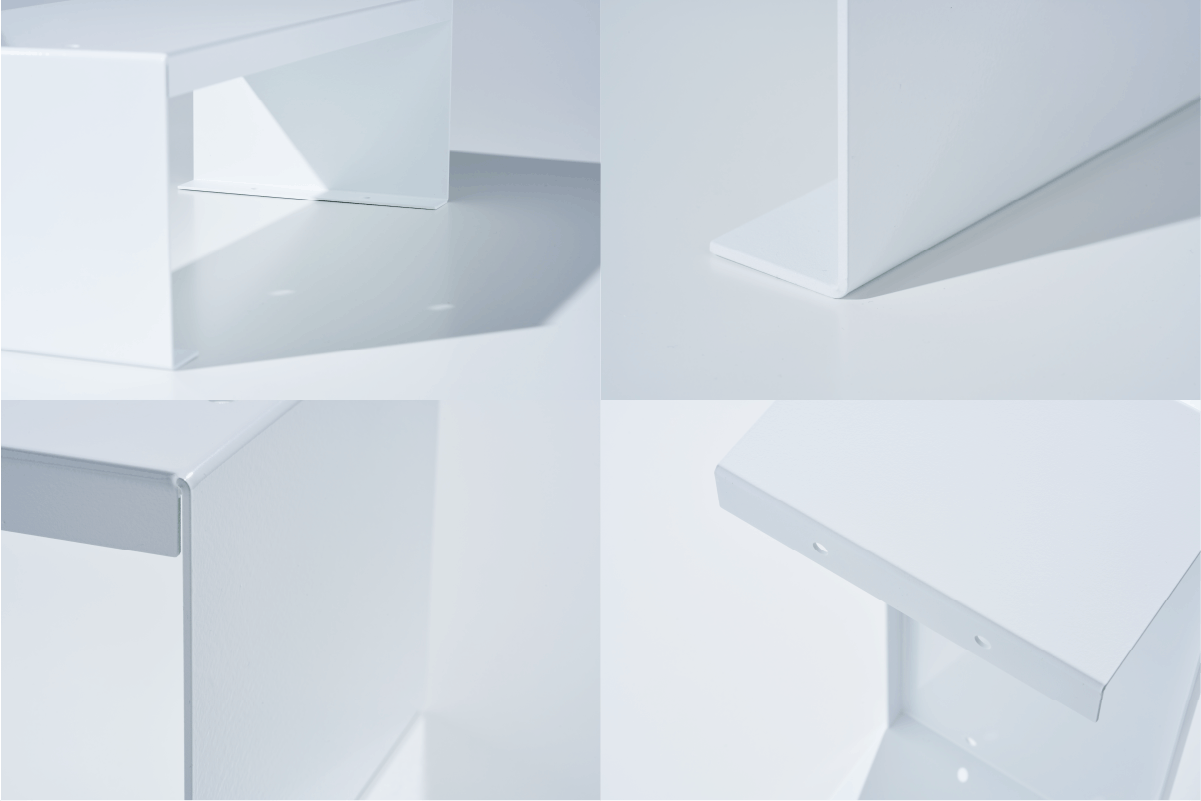 原材料は、厚み2㎜のアルミニウム合金板を加工して製造します。溶接は用いず1枚の板材から曲げ加工で制作します。