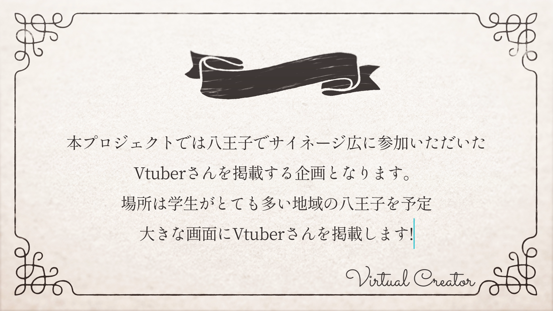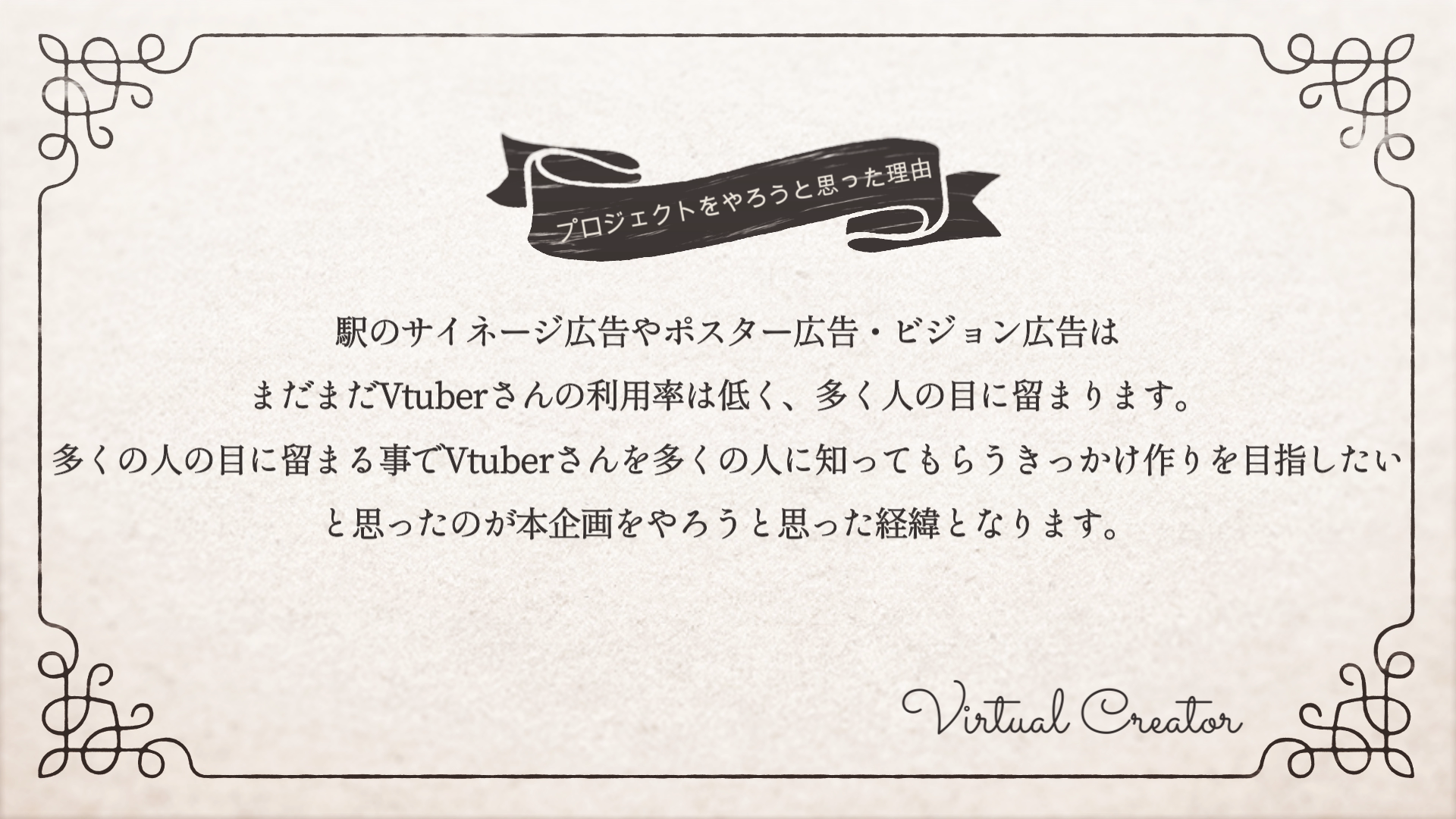 このプロジェクトを通して新しいVtuberさんを見つけるきっかけ作りを促進していきたいと思っております。今まさにVtuber界隈は新時代に突入したばかりです。激動するこの業界で一人でも多くのVtuber様、Vライバー様を支援する事が私達合同会社Virtual Creatorのミッションであると考えております。