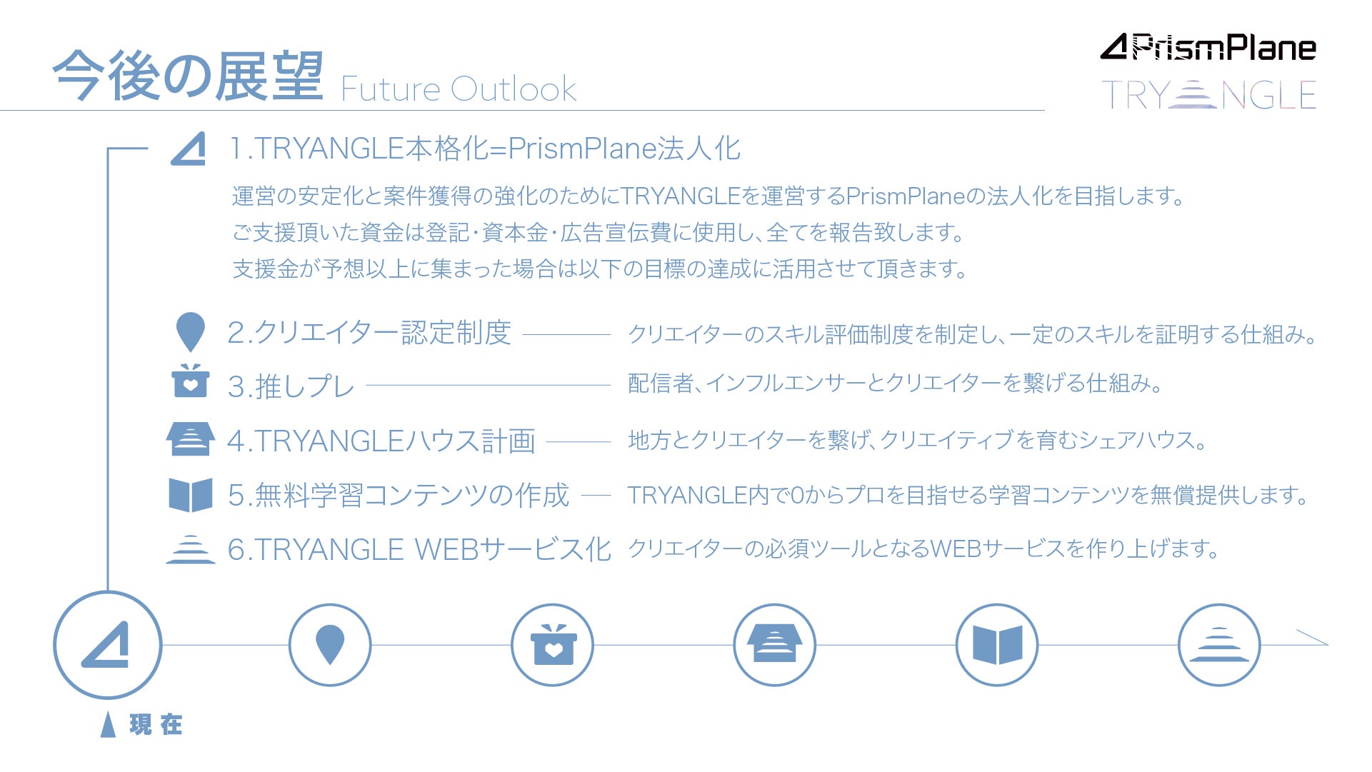 PrismPlaneを法人化し、クリエイターがさらなる案件獲得できるよう、仕事提供のために広告宣伝を行います。余った支援金はTRYANGLEの拡大や今後の活動に使います。支援金の一部はCAMPFIRE手数料にも使われます。