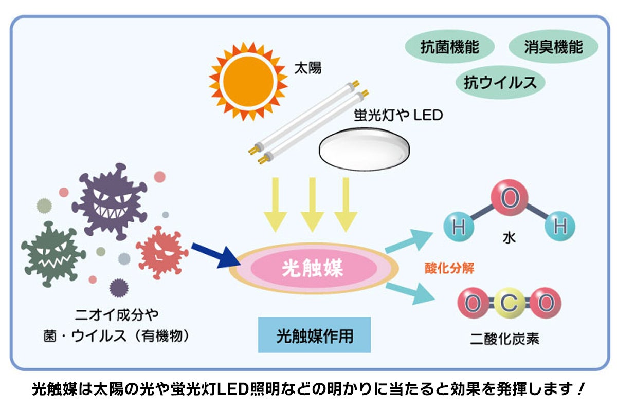 更に光触媒は身近にある室内の明かりや太陽光で働くので環境負荷も最小限に抑えられ、小さなお子様や、ペットのいらっしゃるご家庭でも、安心してお使いいただけます。