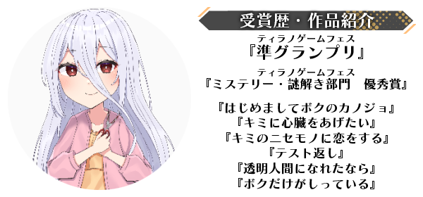ティラノゲームフェスにて、『準グランプリ』『ミステリー・謎解き部門 優秀賞』を受賞する活躍をしております。