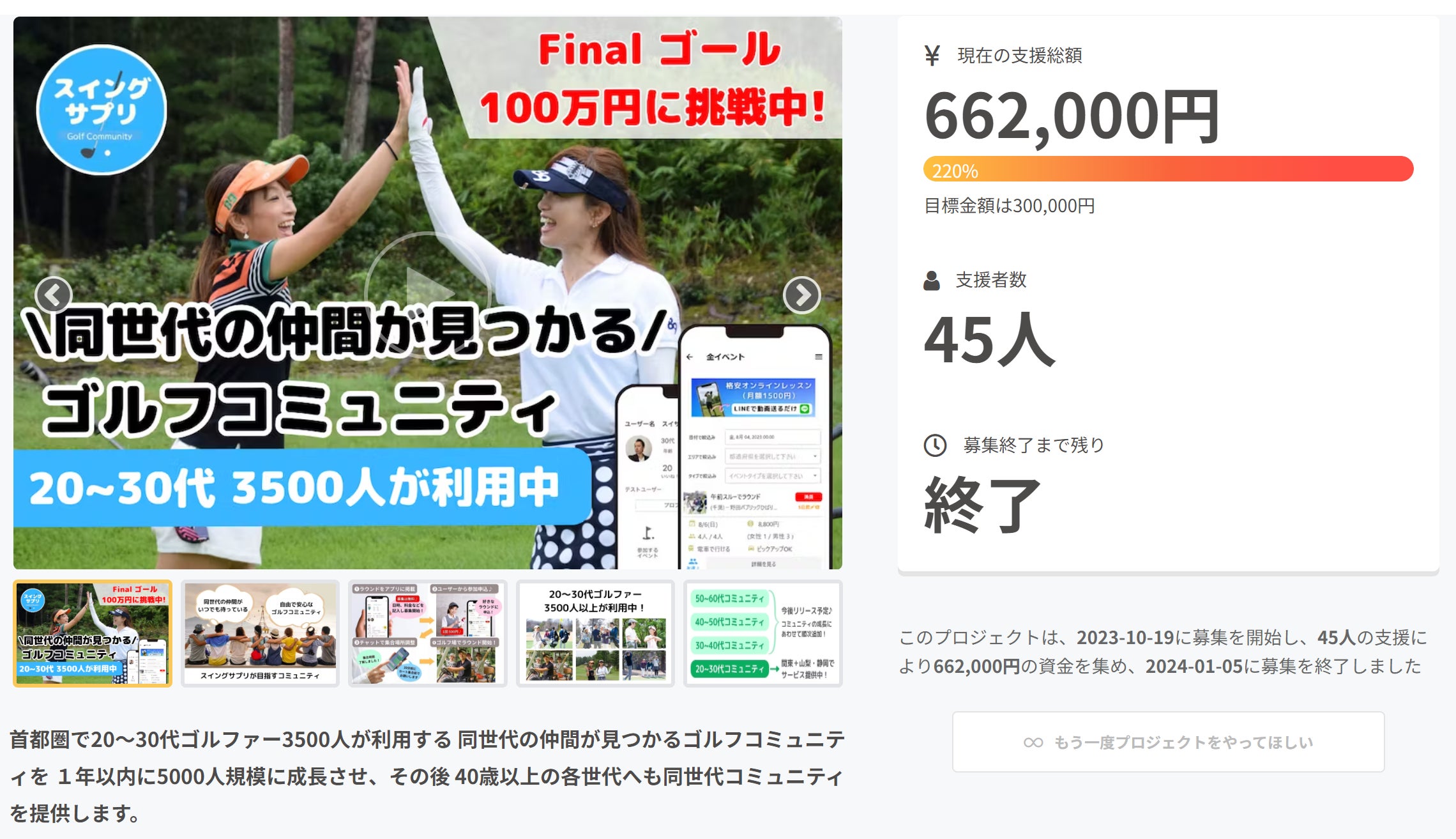 2024/01/06 14:57スイングサプリ代表の古賀でございます。昨日、2024年1月5日をもちましてクラウドファンディングの募集が終了いたしました。皆様のご支援の甲斐あり、当初の目標金額に対し 220% の水準で達成することができました。スタッフの知人・友人我々の活動を見て応援してくれるユーザーの皆様そして私たちスタッフとは直接に面識が内に関わらずご支援頂いた方々様々な方にご支援いただいたくこととなり感謝、感謝、感謝です。皆様から頂いたご支援を活用し今後、スイングサプリは当初の計画通り・1年以内に5000人規模の達成・30ー40代コミュニティの新規開設を目指してまいります。今後も引き続きスイングサプリを宜しくお願いいたします。この度は、ご支援いただき誠にありがとうございました。 もっと見る