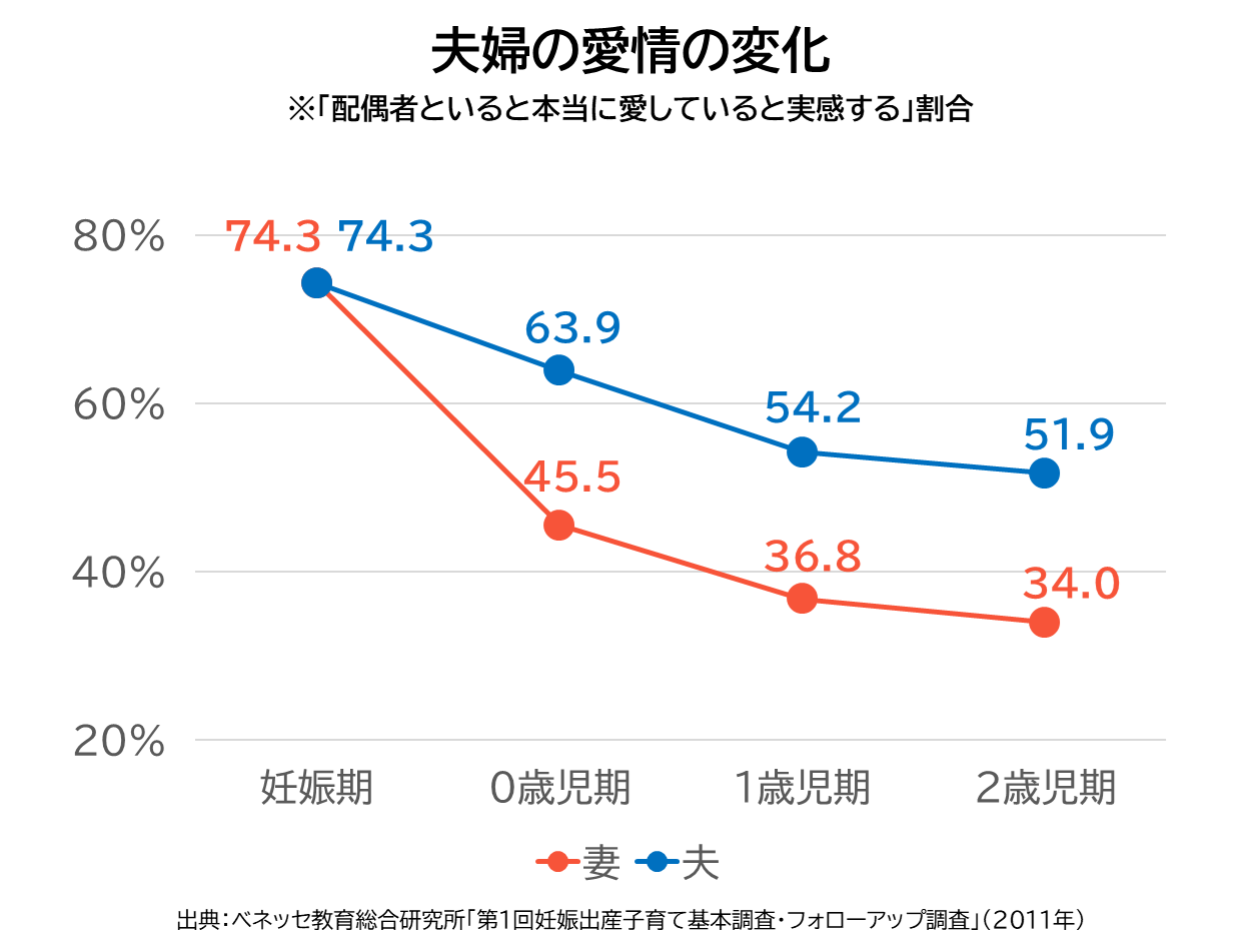 子どもが小さい時期に愛情が低下してしまうカップルが多い要因としては、妊娠・出産前後の女性のホルモンバランスの変化なども影響しているようですが、男性の家事・育児分担率が低く、それにより女性が孤立しストレスをため込んでしまうことが大きいと考えられています。