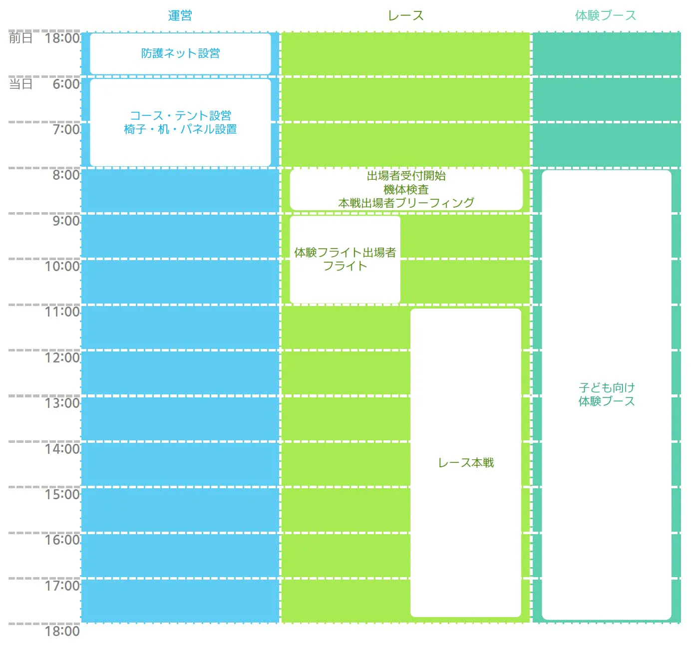 例えば、子供向けドローン操作体験やドローンレースの会場を飛ばすことは滅多にできるものではないので、空撮を趣味にしている方も誰でもコース会場で飛ばすことができるような時間確保して楽しんでもらったり、会場の撮影をした動画を編集して動画コンテストを行ったりとドローンスポーツができない方も参加ができるように考えて実施します。