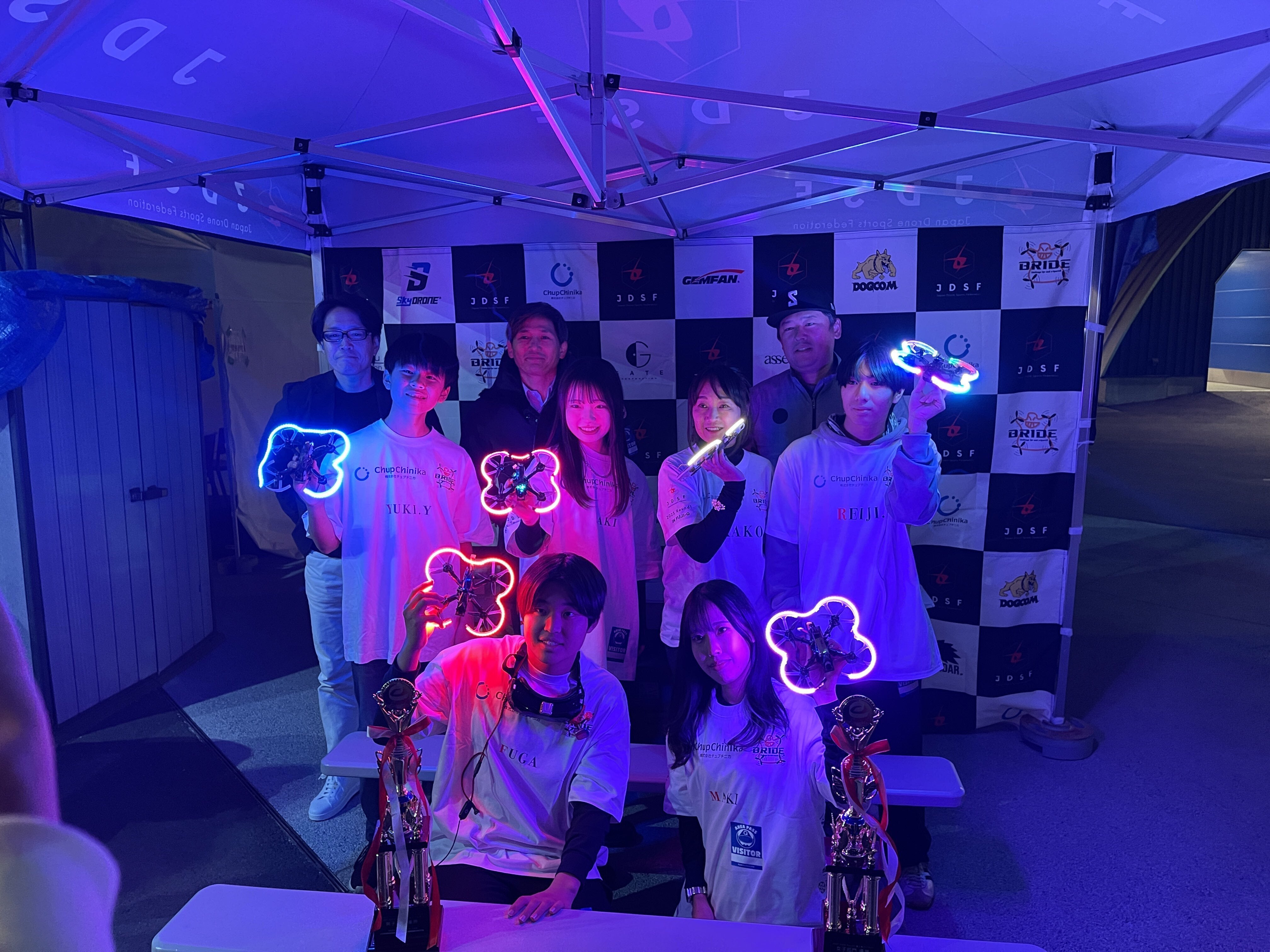2023/11/16 10:24ついに!・・・ついに!!2023 Round1 富士急ハイランドが開催されました!!2度の延期があり多くの方からの期待に応えることができずに悩んでひたすら準備をしてきましたが、やっと念願のプロドローンレーサーによるドローンレースを富士急ハイランドにて開催することができました!当初の時期から延期して秋になったので早く暗くなったのでLEDで彩られた会場が一際目を引いていました。LEDで光るドローンがとても目立って富士急ハイランドを楽しむ方もドローンレースに目を引かれ立ち止まる方も多くアトラクションを待ちながら観戦を楽しむ方も多くいました。会場に併設したドローン体験ブースにも多くの親子連れやドローンに興味ある方が楽しんでいただき多くの方にドローンを身近に感じていただけたのではないかと思います。本番のプロドローンレースは、女子の部、男子の部と分かれて幾つかのレース形式でポイント加算式で競っていただきました。女子の部では、疾風のJKレーサー サキ黄色い妖精 キッシー魅惑のシャークバイト マキ男子の部では東の天才ルーキー YUKI七色の魔術師 レイジ絶対王者 FUGA どちらのレースも接戦で白熱した試合が繰り広げられました!そんなレースを勝ち抜いて王者を獲得したのは女子の部では、魅惑のシャークバイト マキ選手男子の部では、絶対王者 FUGA選手が勝利を収めました。女子の部優勝マキ選手と男子の部優勝FUGA選手には、株式会社トラストワーク代表今井様、JDSF代表理事の大河原よりトロフィーと景品として株式会社山梨さえき様より協賛いただいた山梨特産のほうとうを贈呈させていただきました。当レースは2回の延期がありましたが、やっとこのような形で無事開催できました。これも皆様のご支援やご協力あってのことです。今後はドローンスポーツの発展のため活動を加速できればと考えております。これに懲りずに引き続き応援いただけますと幸いです。重ね重ねにはなりますが、富士急ハイランドでのドローンレースの皆様のご支援に厚く御礼申し上げます。皆様の期待に応えられるよう尽力して参りますので、引き続き応援のほどお願い申し上げます。一般社団法人日本ドローンスポーツ連盟<当日の様子> もっと見る
