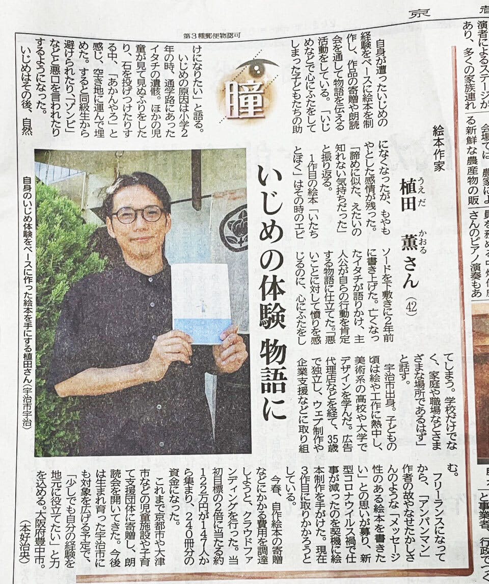 2023/06/05 14:53植田薫です!クラファンが終了してもうすぐ1ヶ月経とうとしています。ほんとにあっという間に時間は過ぎてしまいますね。。今年も折り返し地点に差し掛かりました。本日、京都新聞で絵本が紹介されました!クラウドファンディング中にプレスリリースを送ったところ、取材のオファーがきたんですよね^_^ほんとラッキーです。なかなか取材の日程が合わず、ゴールデンウィーク後の取材でした。実家の方でお話しできたので、お母さんからも当時の話をいろいろ(それ以上に家族の話で度々脱線^_^;)してくれて、濃い取材だったそうです。地元での活動も、この新聞を、皮切りにやっていけたらと思います!朗読会、できそうな児童施設ありましたらお気軽にお声がけください! もっと見る