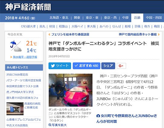 2018/04/06 18:10JUNBOwです!昨日、神戸経済新聞さんに「YATSU GA KURU(ヤツガクル)」の情報が掲載されました。ビックリしたことに記事への反応も異常なくらいよいとの事で嬉しい限りです。神戸経済新聞:https://kobe.keizai.biz/headline/2845/当日は東北から今野さんをお招きして震災に段ボールで立ち向かったお話をお聞きしますね~「わるプロ」らしく平日の14:00スタートとなかなか来場しにくいイベントになっていますが…ククク…また、会場の都合で定員が100名限定になってるので是非話聞きに来てください~会場でお待ちしています~ JUNBOw(2018/4/6) もっと見る