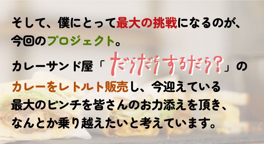 今回のCAMPFIREでの挑戦は、サバ嫌いの私が何度でも食べたいと思った「サバカレーサンド」の味をご自宅でも食べれるということで、