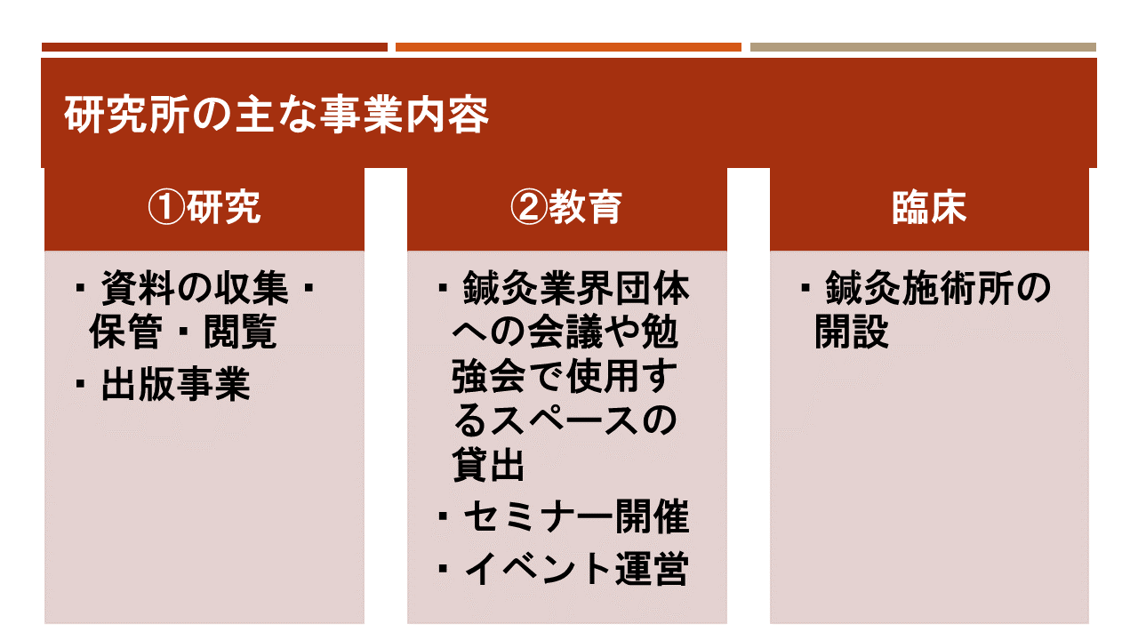 そこで、鍼灸の臨床・教育・研究を、持続的かつ安定的に実現できる場を作りたい!と思い、研究所の創設を決意しました。