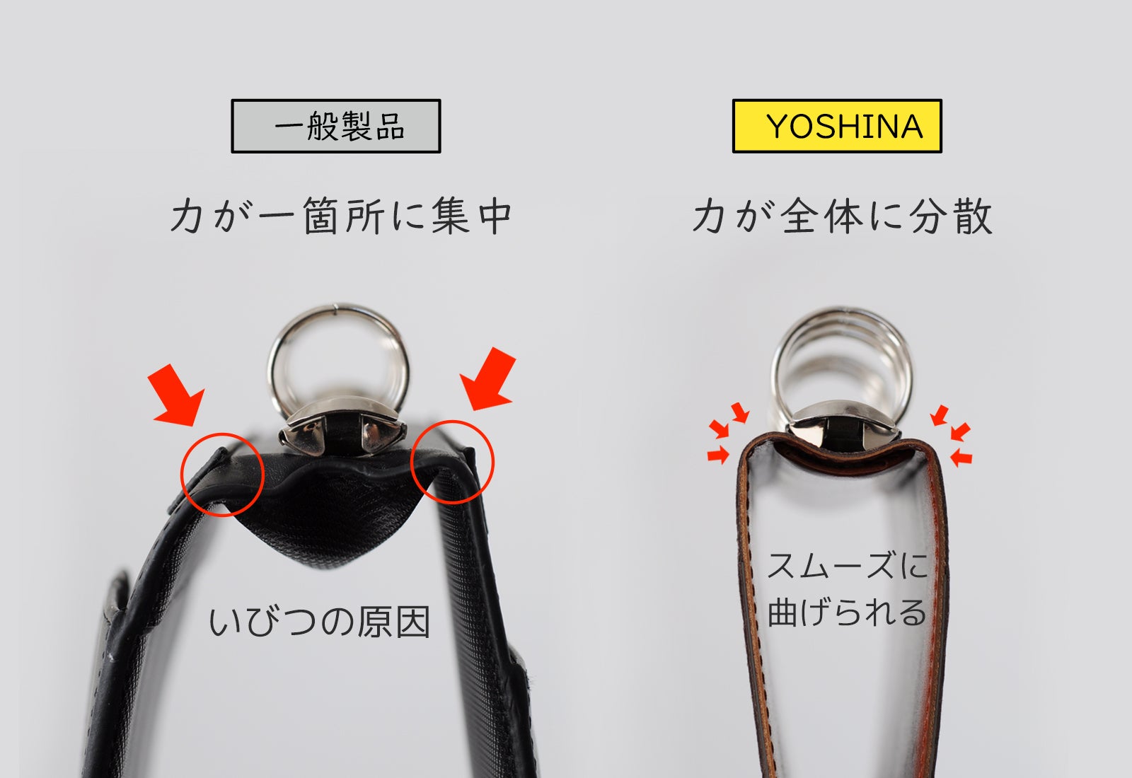 YOSHINAは使い手の立場に立って、使用する素材の選定から製品の構造、細部の仕上げまですべて自社工房にて試作・改良を繰り返しています。また、量産も自社工房にて行うため、より良い素材を使用し、自分たちの創りたい製品を実現することができます。