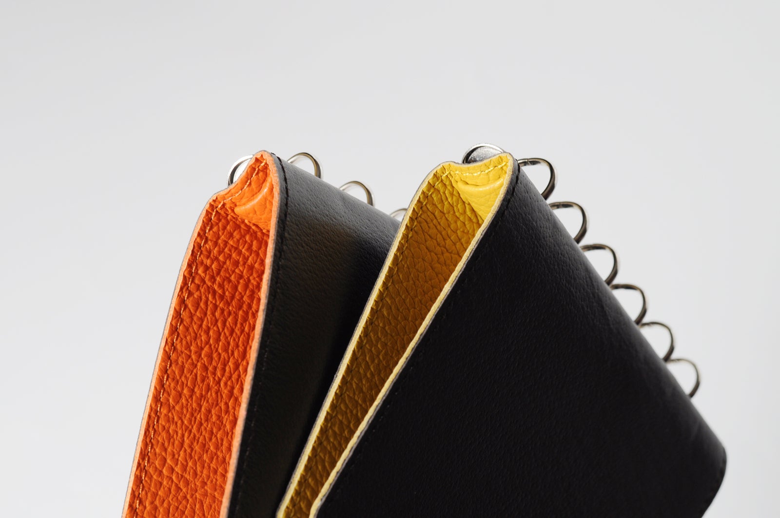 バックプレートとリングで貼り合わせた一枚革を挟む構造により、完全に開いた状態で使用できます。また、デスクがない環境では折り返した状態で使用可能です。