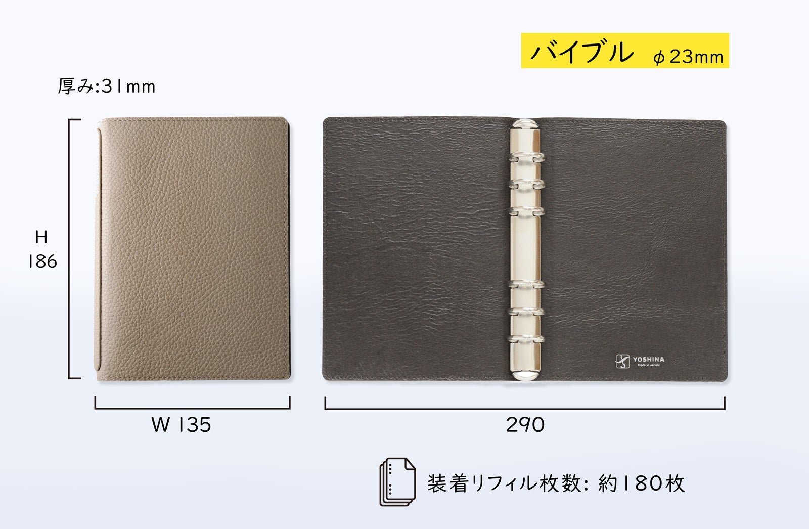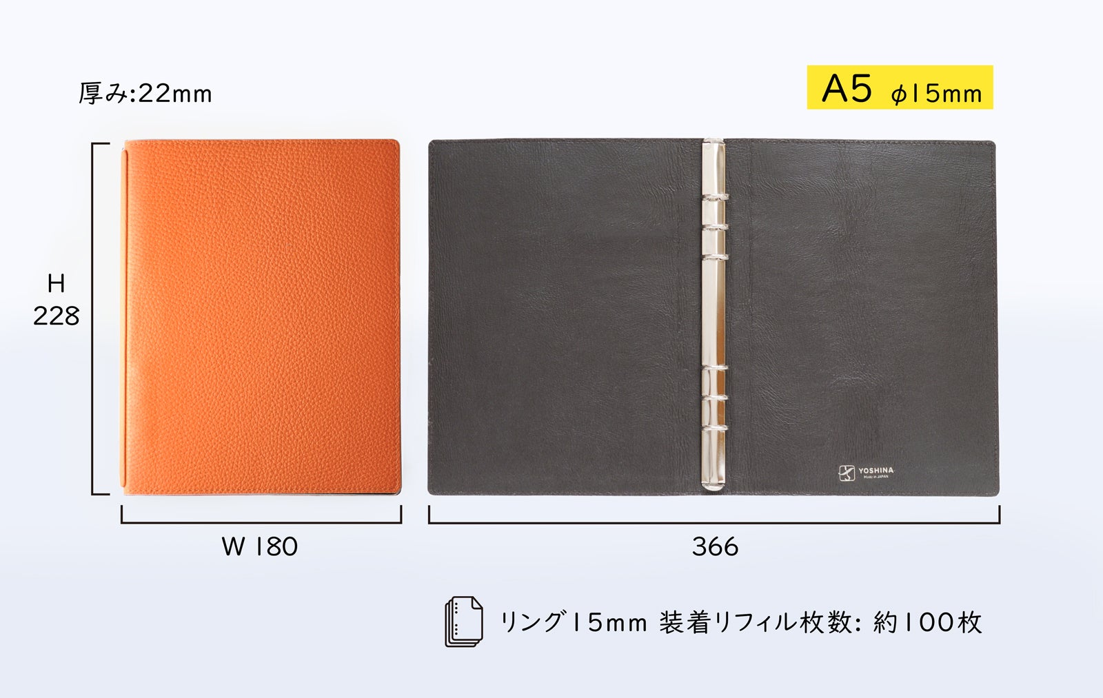 YOSHINAは使用スタイルとシーンにより、3種類の手帳サイズとリング径違いの製品をご用意しました。