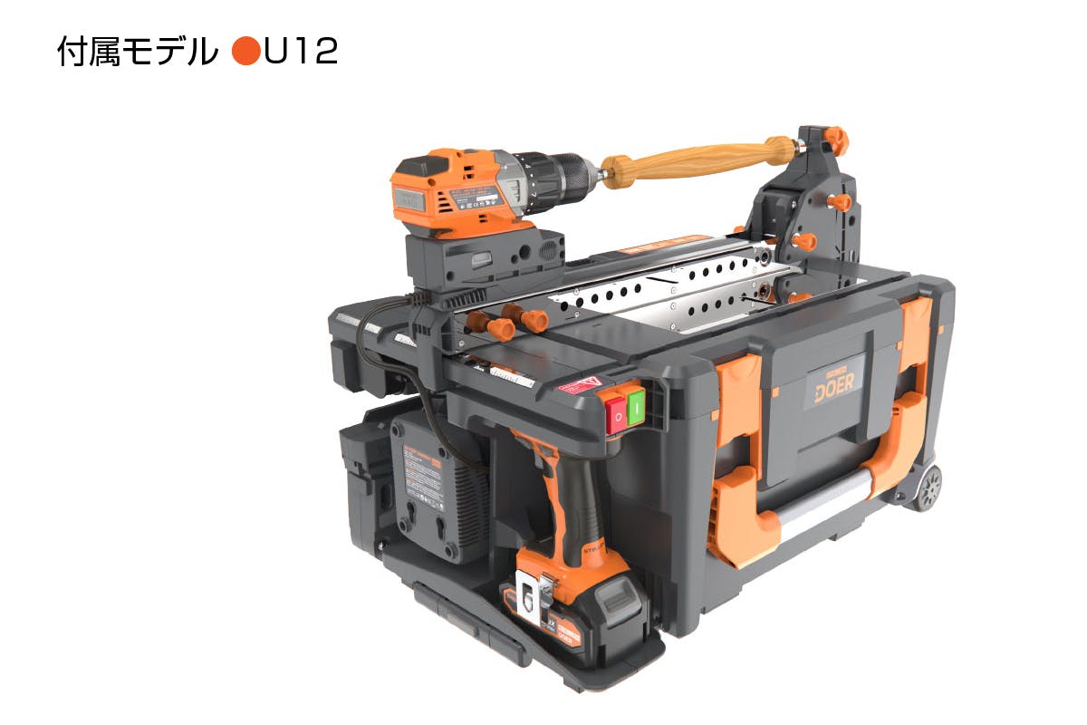 電動工具セット“DOER”には、数々のパテント技術が詰め込まれていて、「こんな使い方もできるんだ!」という驚きの連続です。場所を取らず、簡単に持ち運びができるだけではなく、各電動ユニットとワークケースが組み合わさり、幅広く作業を行うことができます。