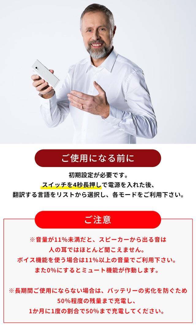 一から英語や他言語を学び直す時間はなくても、こういう文明の機器に頼るのもひとつの方法だと思うのです。違う国の方とも「母国語」で会話ができることで安心感を得られます。お守り代わりに小さなポケットサイズの通訳さんとして、外国語が全く話せない人でも安心してお使いいただけます。もちろん、英語は話せるけど他の言語はちょっと、、という方にもぜひおすすめしたいです。