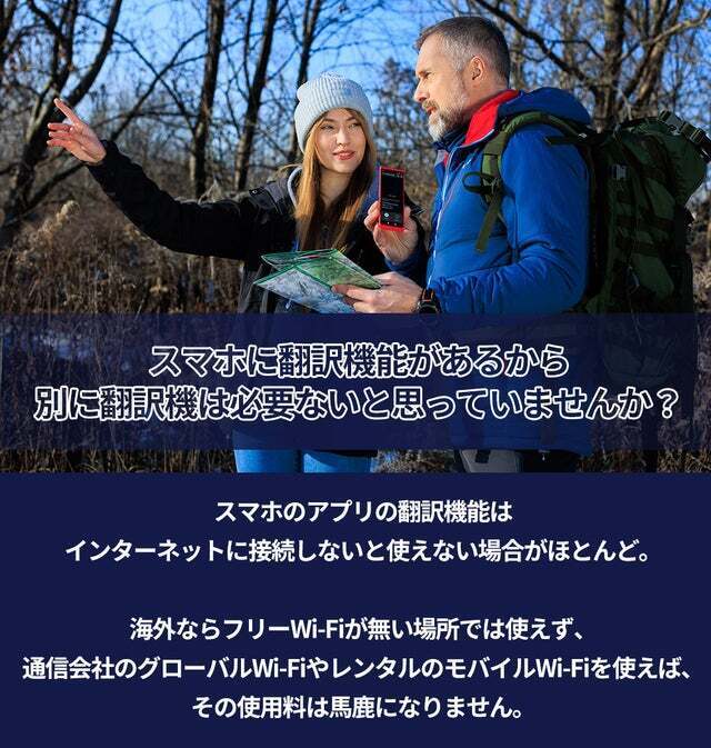 通信料無料のSIMカード内蔵でWi-Fiが無い地域でもインターネットに接続し、多彩で精度の高い翻訳を行います。