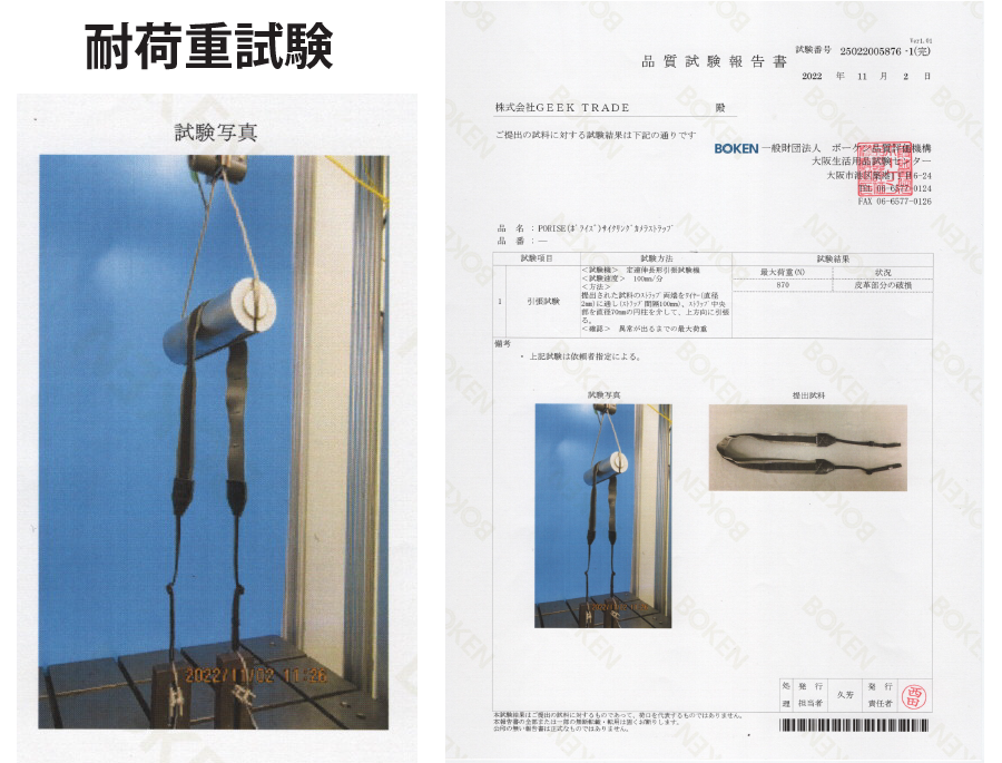 国内検査機関にてストラップの耐荷重試験を実施。両端はニコン巻き。約88kgにて破断