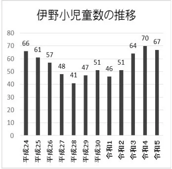 伊野は島根半島中央部に位置し、北は日本海、南は宍道湖に面し、中央部は里山と水田が織りなす美しい風景が広がっています。人口は1,200人弱。2015年、伊野小学校の存続を決めたことを契機に、子どもを真ん中においたまちづくりが活発に進められました。児童数は年々増え、今年は67人です。しかし、これから激減期を迎え、数年後には30人を切るかもしれないという危機を迎えています。