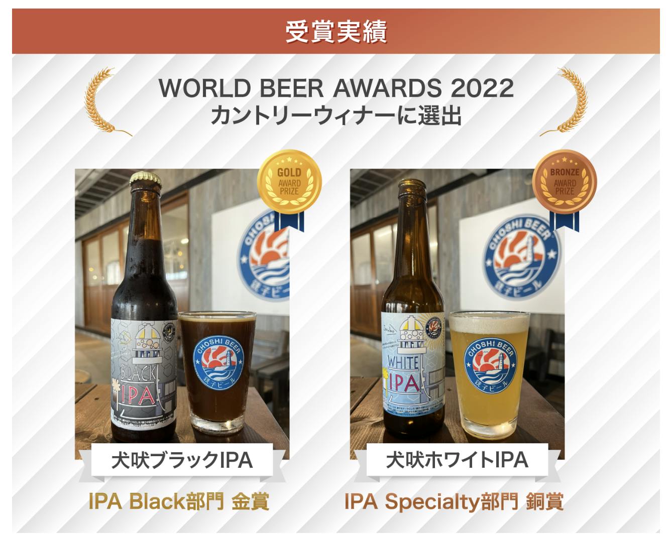 犬吠埼灯台をモチーフにした「犬吠ブラックIPA」「犬吠ホワイトIPA」が、昨年イギリスで開催された国際的なビールコンテスト、WORLD BEER AWARDS 2022でそれぞれ金賞(ContoryWinner同時受賞)・銅賞を受賞することができました。2021年には日本国内で開催された国際的なビールコンテストIntarnational Beer Cup2021においてもそれぞれ銀賞・銅賞を受賞しました。