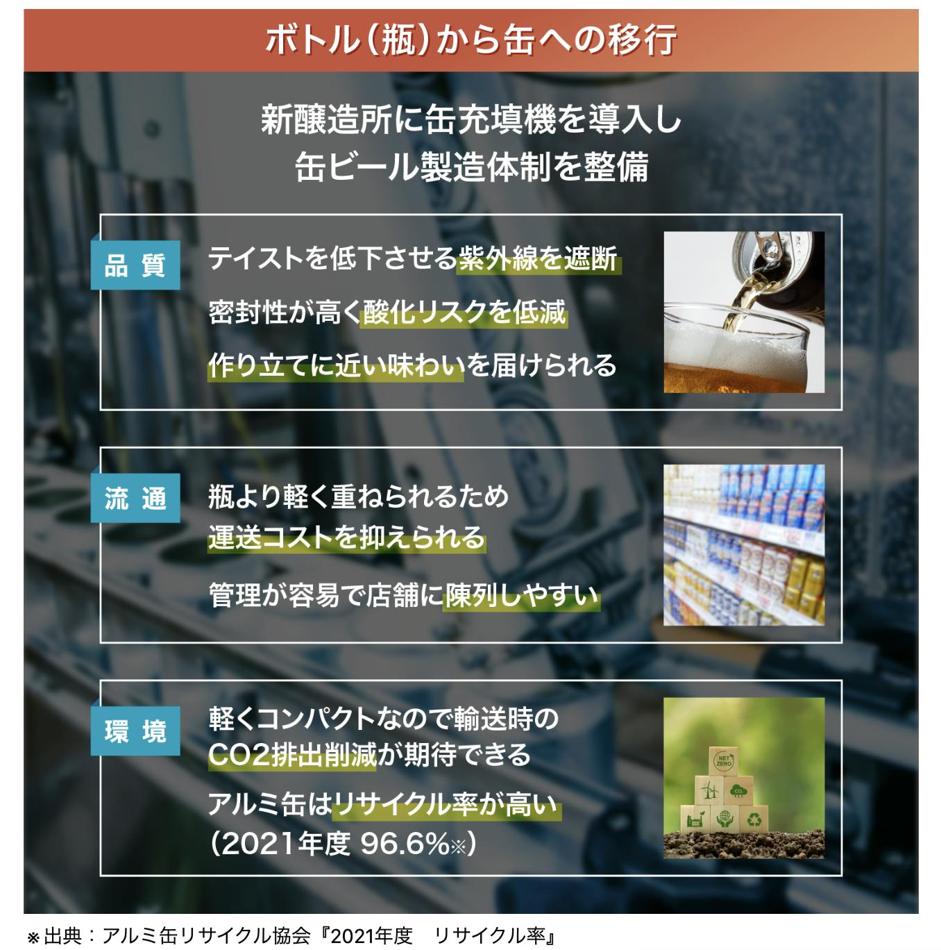 また、缶はリサイクル率も96%を超えており、環境への配慮もでき、まさに街も地球もチョウシよくする持続可能な醸造所(=サステナブルワリー)に近づくための手段にもなると考えています。