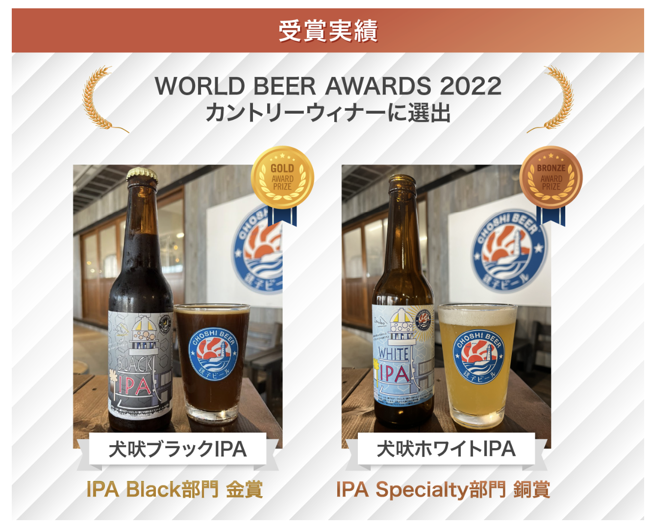 犬吠埼灯台をモチーフにした「犬吠ブラックIPA」「犬吠ホワイトIPA」が、昨年イギリスで開催された国際的なビールコンテスト、WORLD BEER AWARDS 2022でそれぞれ金賞(ContoryWinner同時受賞)・銅賞を受賞することができました。2021年には日本国内で開催された国際的なビールコンテストIntarnational Beer Cup2021においてもそれぞれ銀賞・銅賞を受賞しました。