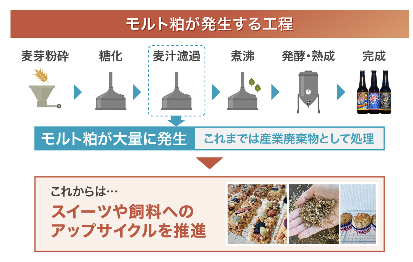 クラフトビールは醸造後には、モルト粕が大量に発生します。大麦を発芽させたモルトは、麦汁を作る糖化の工程で、主にでんぷんだけがつかわれるため、低糖質で食物繊維が豊富な粕が残ります。さらに、大麦は白米と比べて高タンパクで栄養価が高いので、お菓子の原料や畜産の飼料として使うこともできます。応援メッセージもしてくれている発酵料理研究家の中山さんと連携し、モルト粕を使用したスイーツやシリアルバーを販売しています。さらなるモルト粕の活用を目指して開発を進めています!