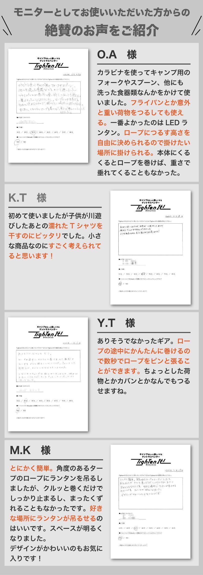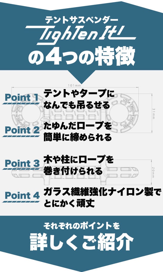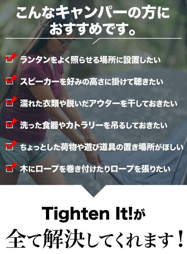 アクセサリーとしてもテントサスペンダーとしても使えるこの『Tighten It!』が、日本の皆さんのアウトドアをより豊かなものにしてくれる。私たちはそう信じています。